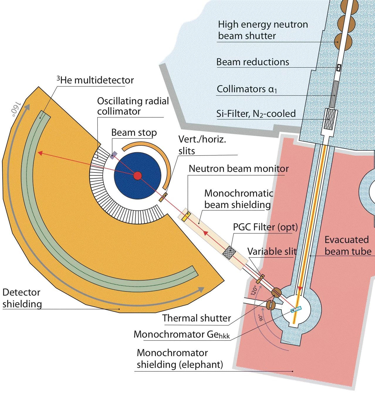 | Primary collimation: | Gd-O Soller collimators with primary white beam collimations α1 = 6', 12', 24' (high resolution), - = approx. 40' (high intensity) |