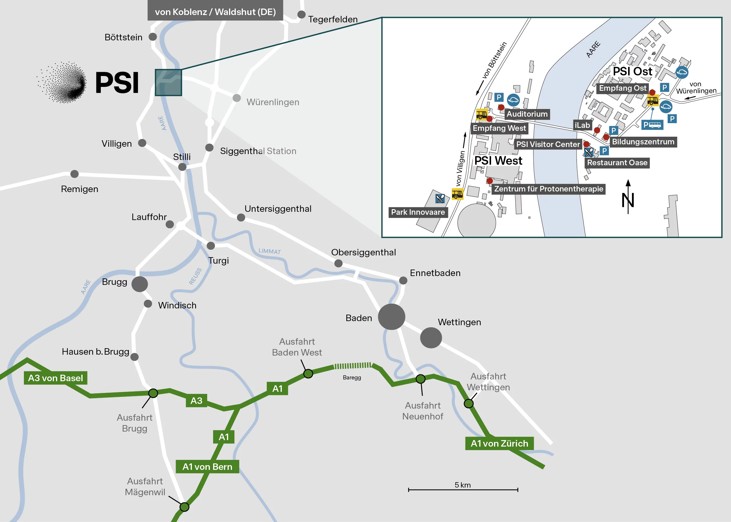 Das PSI liegt im Norden der Schweiz, etwa in der Mitte zwischen den Städten Zürich und Basel. Nahe gelegene Städte und Bahnstationen sind Baden und Brugg. Regelmässige Flugzeug- und Bahnverbindungen via Zürich oder Basel sind von allen europäischen Städten verfügbar.