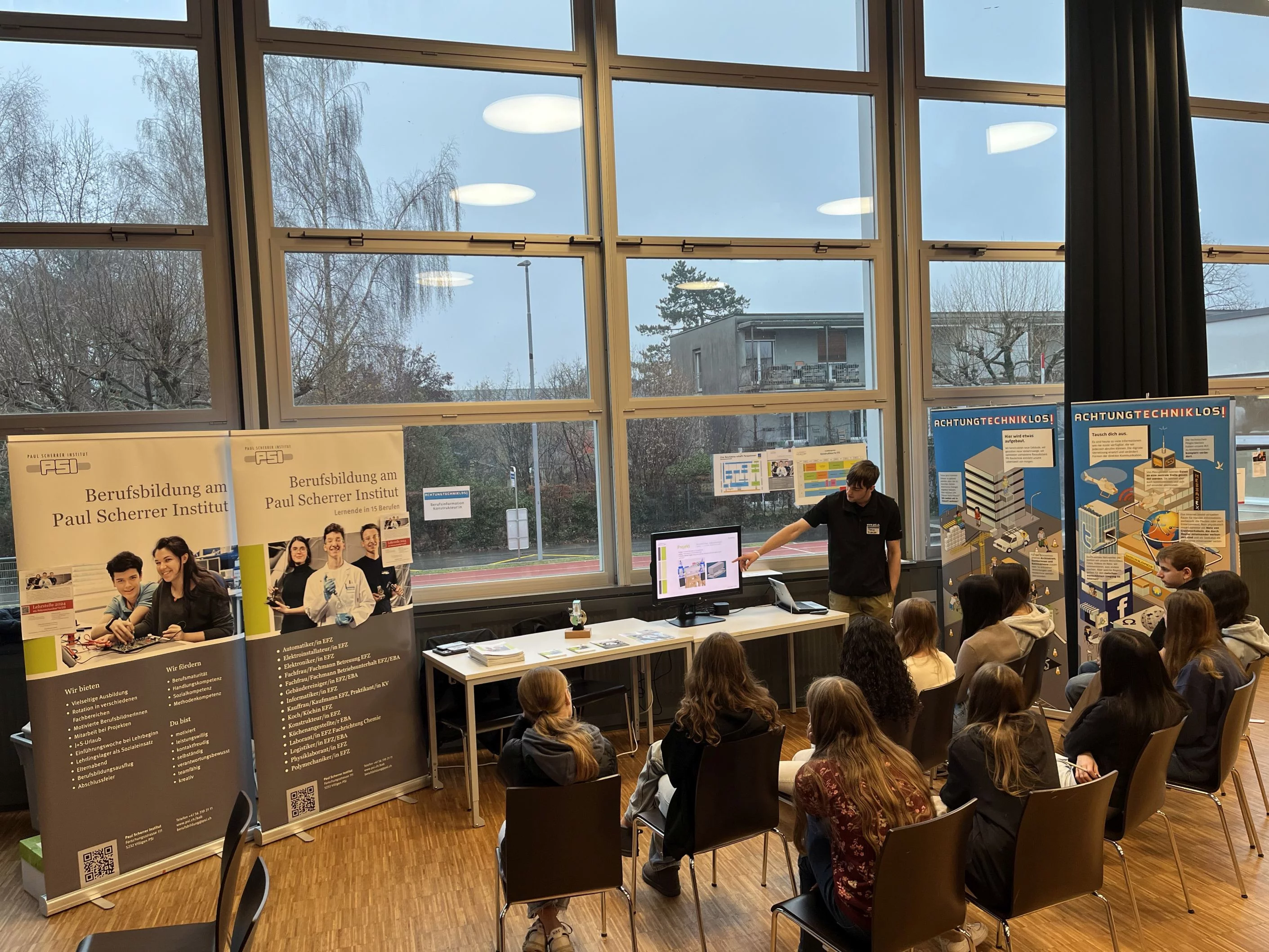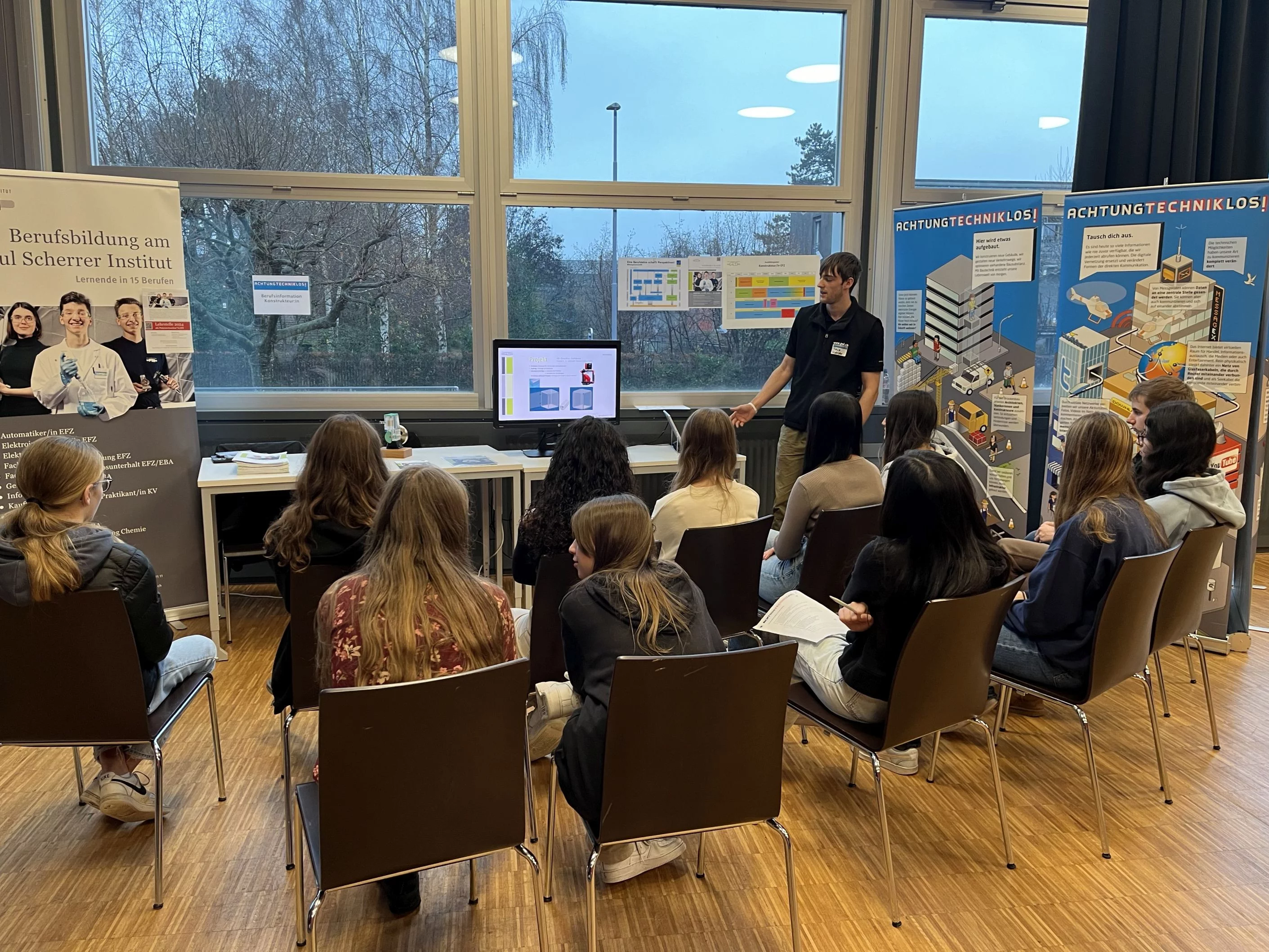 Wir von der PSI-Berufsbildung konnten am 12. Dezember 2023 an einem dieser Berufsinformationsanlässen in Lenzburg teilnehmen. Reto Acklin präsentierte zusammen mit zwei Lernenden den Beruf des Konstrukteurs. Viele interessierte Schülerinnen und Schüler sowie Lehrpersonen wollten mehr wissen und ein reger Austausch fand statt.