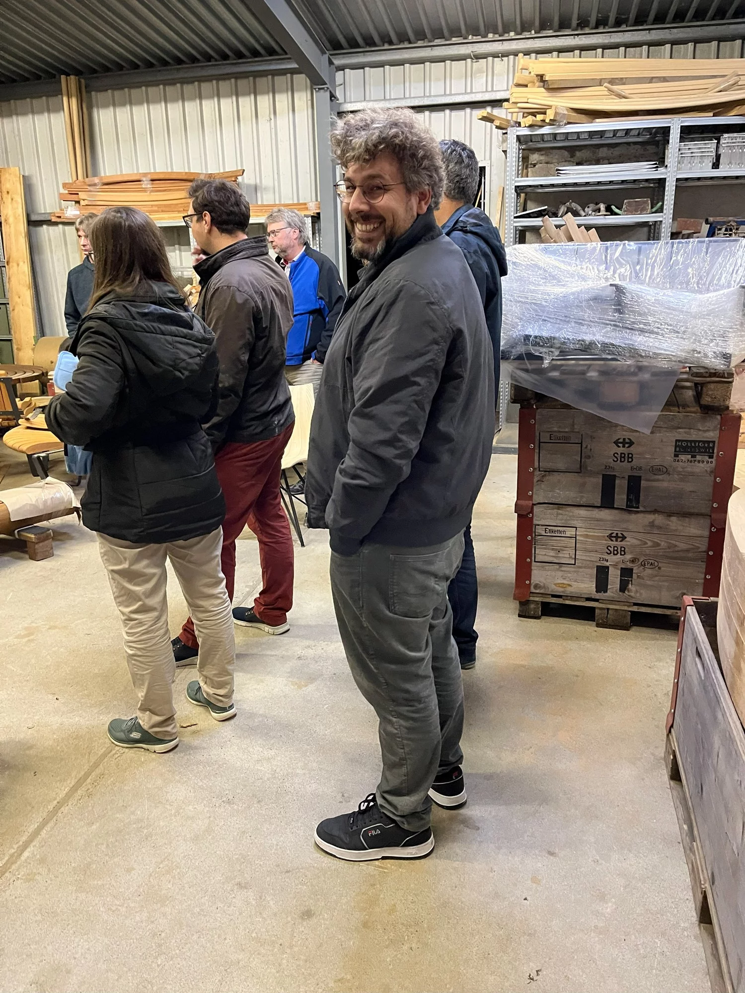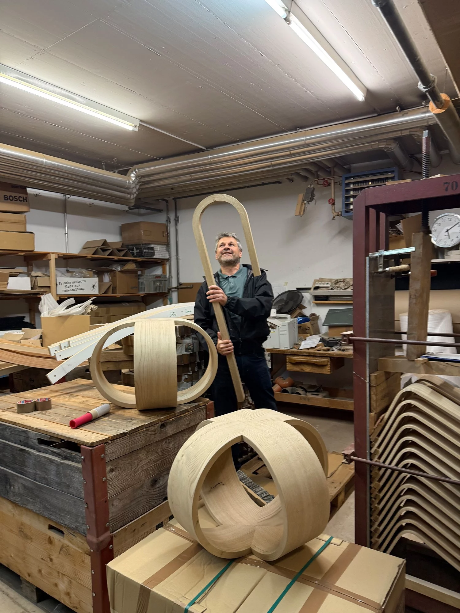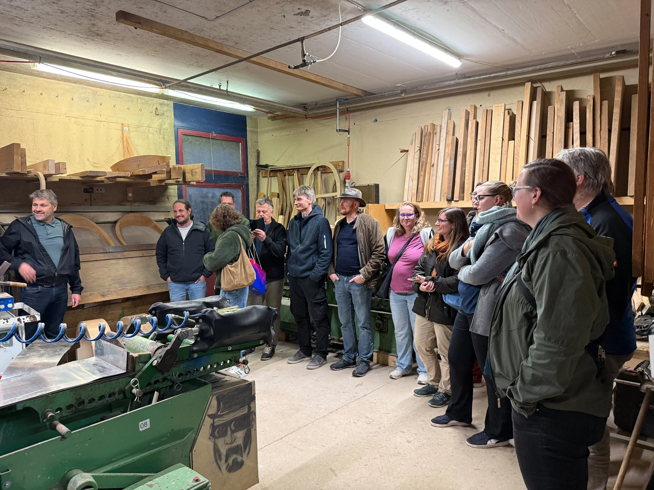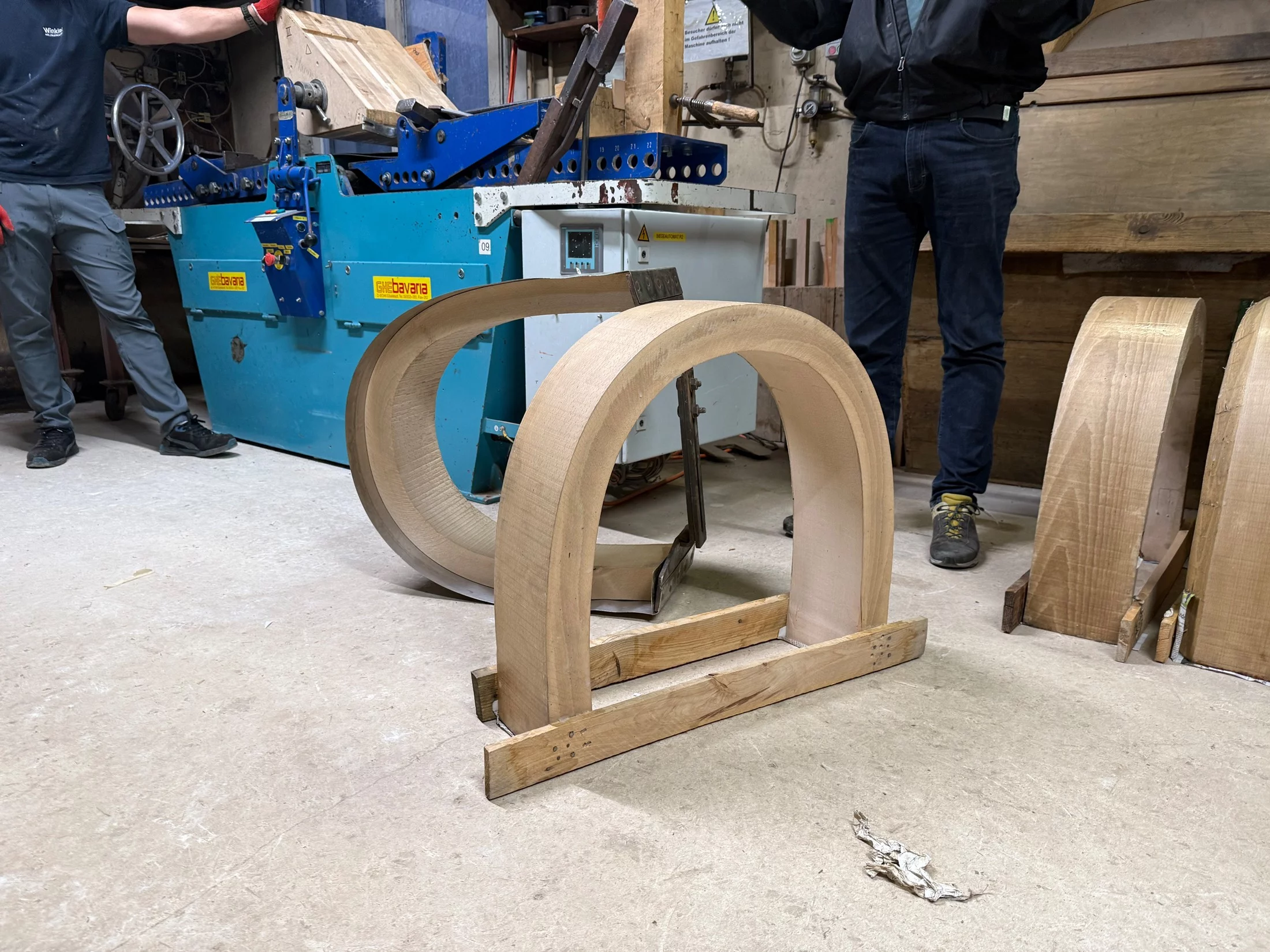 Während der Führung tauchten wir in die spannende Technik des Holzbiegens ein: Durch das Erhitzen des Holzes unter Dampf wird das Lignin, der «Klebstoff», der die Holzfasern zusammenhält, weich. Anschliessend kann das Holz mithilfe von Biegemaschinen, Zugblechen oder je nach Dimension auch von Hand in eine neue Form gebracht werden. Beim Abkühlen erhärtet das Lignin wieder, und das Holz behält seine neue Form. Damit diese beim späteren Trocknen formstabil bleibt, braucht es spezielle Vorrichtungen, regelmässige Kontrolle und vor allem viel Erfahrung.