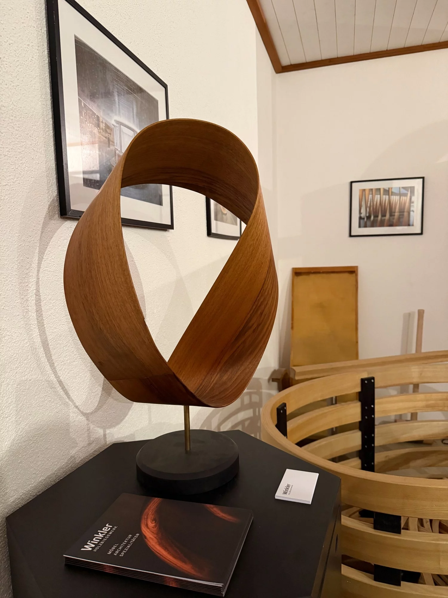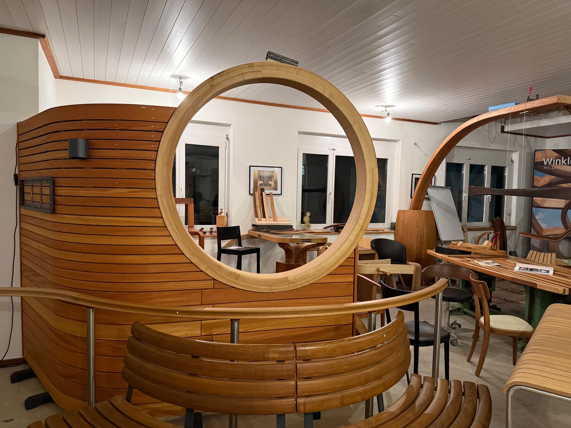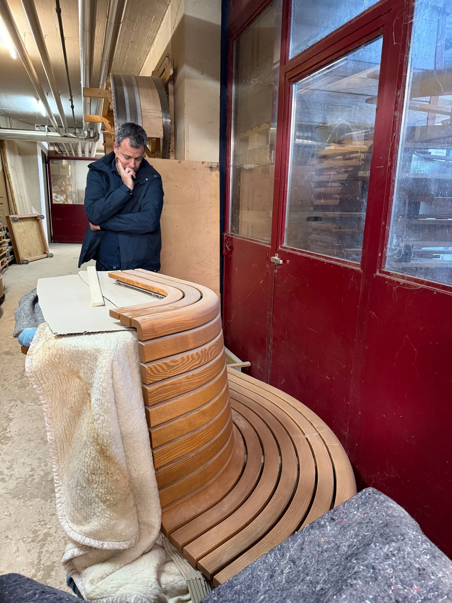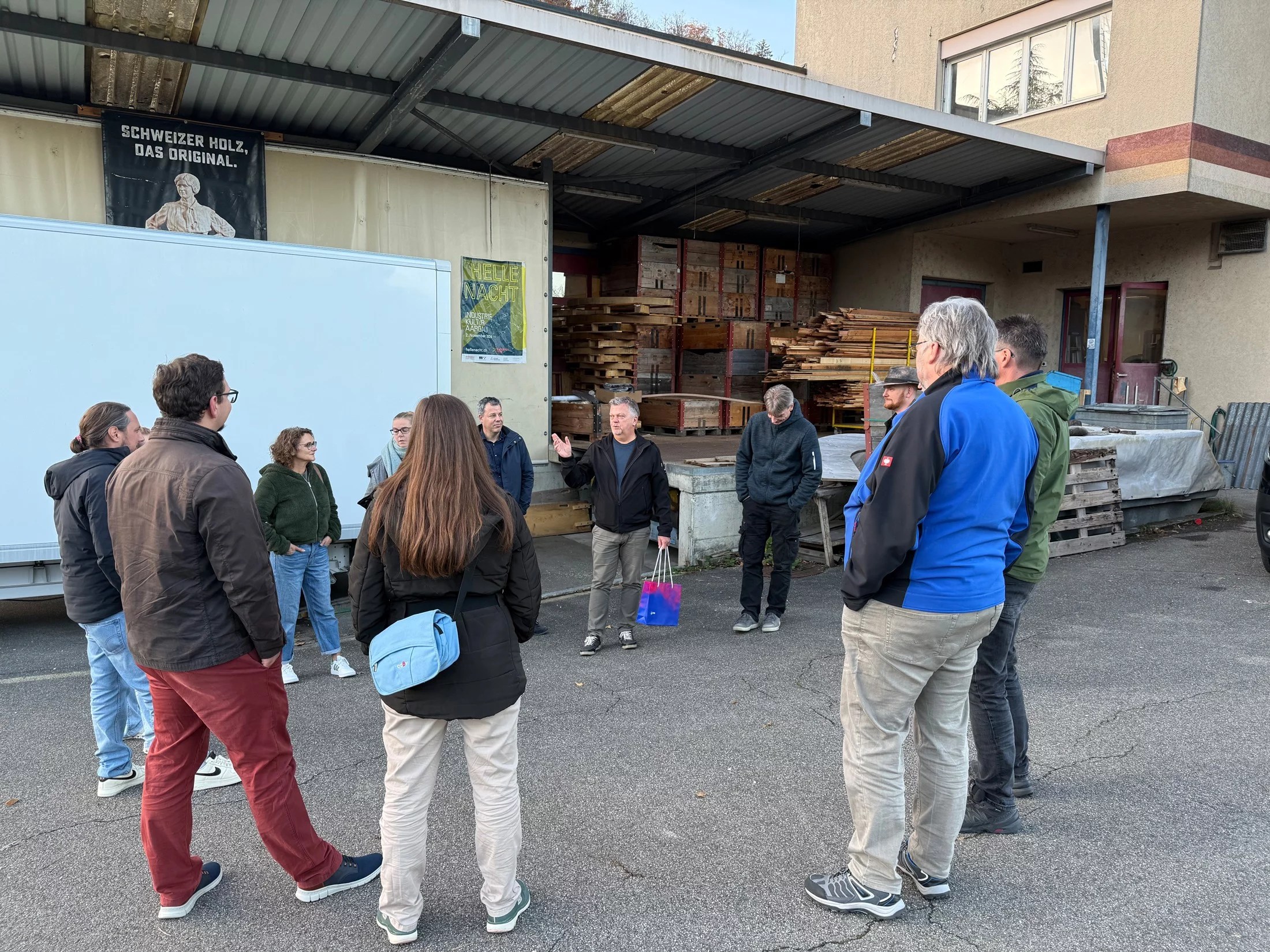 Während der Führung tauchten wir in die spannende Technik des Holzbiegens ein: Durch das Erhitzen des Holzes unter Dampf wird das Lignin, der «Klebstoff», der die Holzfasern zusammenhält, weich. Anschliessend kann das Holz mithilfe von Biegemaschinen, Zugblechen oder je nach Dimension auch von Hand in eine neue Form gebracht werden. Beim Abkühlen erhärtet das Lignin wieder, und das Holz behält seine neue Form. Damit diese beim späteren Trocknen formstabil bleibt, braucht es spezielle Vorrichtungen, regelmässige Kontrolle und vor allem viel Erfahrung.