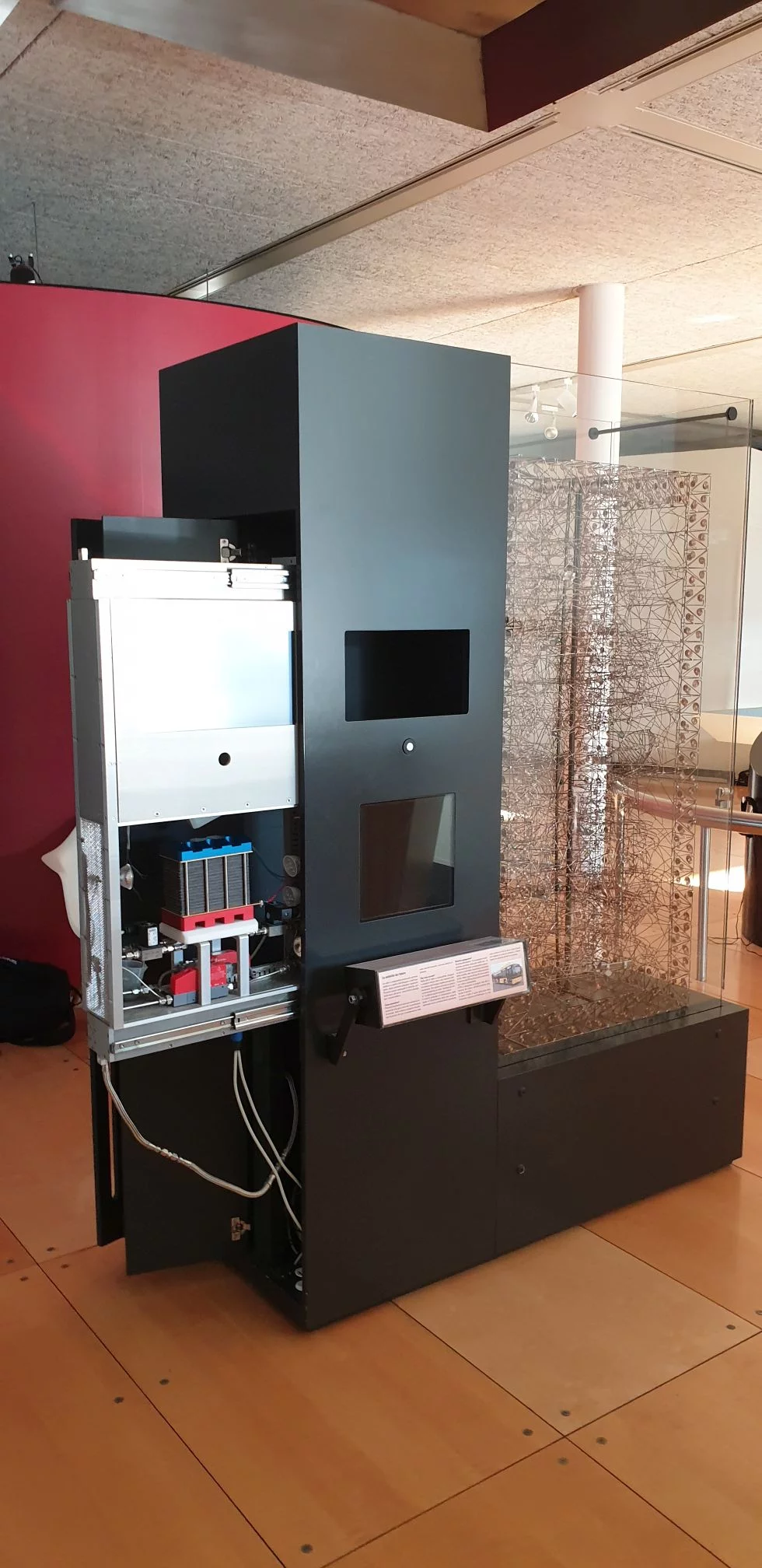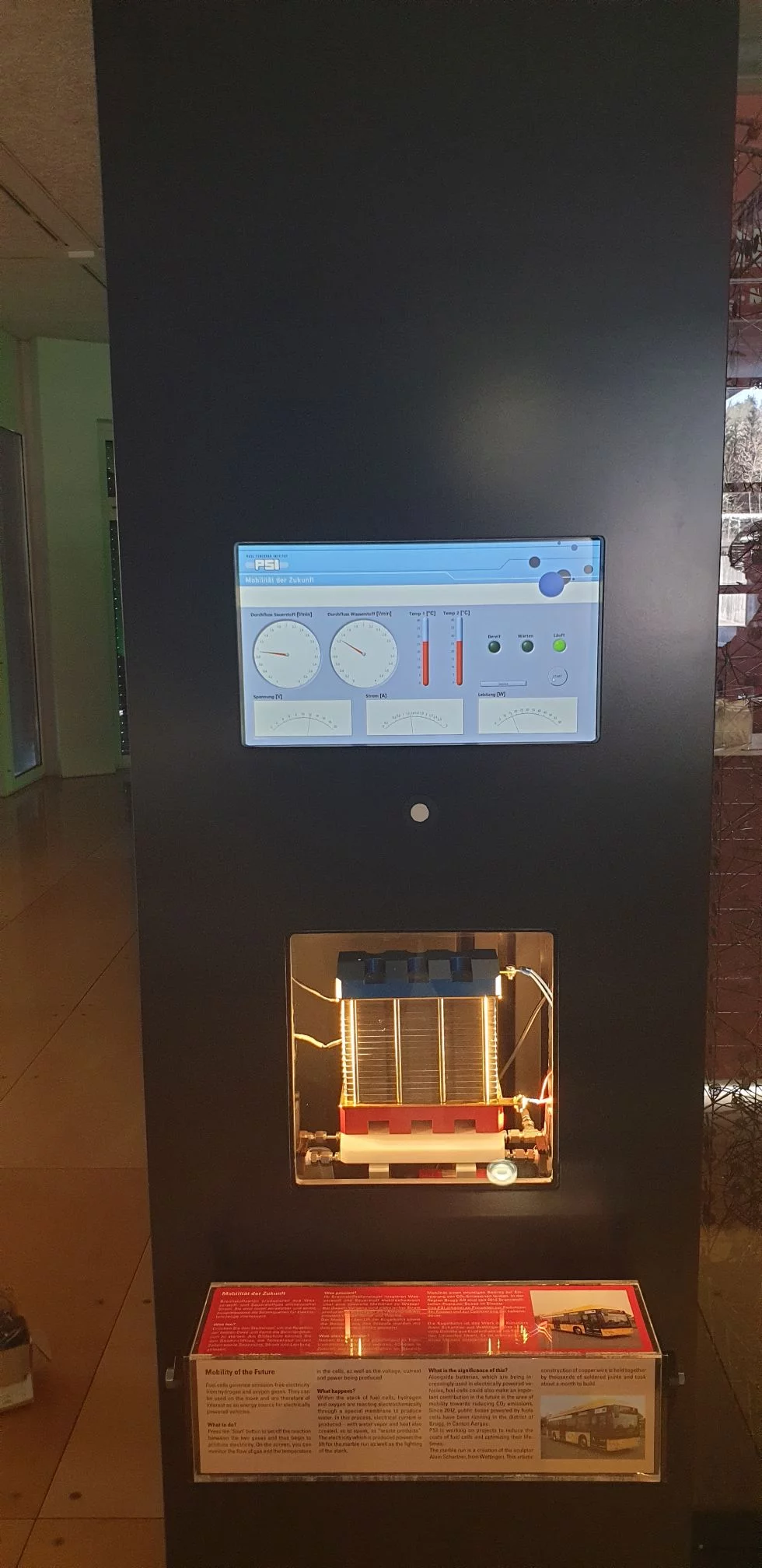 Das Brennstoffzellenexponat im PSI forum funktionierte einige Jahre einwandfrei. Es wurde von einem Physiklaboranten im Rahmen seiner praktischen Abschlussarbeit aufgebaut. Eine Brennstoffzelle treibt einen Motor an, welcher Kugeln von unten nach oben transportiert. Dann rollen sie über eine kunstvoll gelötete Kugelbahn mit einigen Klangeffekten runter. Den Ablauf des Versuches konnte man über eine Taste starten und dann Werte wie Strom, Spannung und die Gasdurchflüsse von Sauerstoff und Wasserstoff auf einem Bildschirm beobachten. Die Steuerung des ganzen Versuchs wurde in einem Ausziehschrank versteckt.