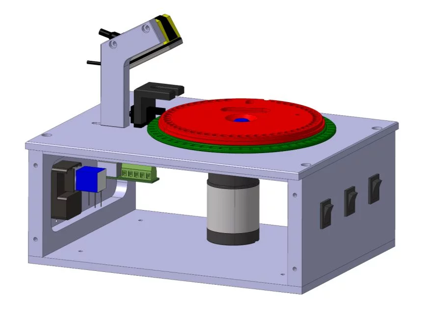 In einem dritten Schritt wurden von der AVOR (Arbeitsvorbereitung) das Material und alle anderen Teile, die man nicht am Lager hat, bestellt. Das braucht meist Zeit, da die Lieferzeiten der Hersteller unterschiedlich sind. Sobald sie eintreffen, wird der Auftrag in die Fertigung gegeben. Meine Bauteile wurden nun also durch die Lernenden Polymechaniker hergestellt. Nach rund 8 Wochen konnte ich die gefertigten Teile erstmals anfassen. Ich war stolz, meine eigens konstruierten Teile sehen zu können. Jedoch waren wir noch nicht am Ende, die Teile mussten ja noch zusammengebaut werden und die Elektronik fehlte auch noch. So gingen die Teile auch gerade dorthin, zu den Lernenden Elektronikern. Sie verbauten diverse Stecker und Anschlüsse, sowie die Leiterplatte mit der Steuerung und natürlich auch den Elektromotor, der die Aufnahmescheibe bewegen sollte (rot markiert). Nach zwei weiteren Wochen erhielt ich die Nachricht von den Elektronikern, dass das Auslesekarussell fertig gestellt worden ist. Das Auslesekarussell konnte dem Auftraggeber übergeben werden. Es war für mich ein toller Moment, da ich das eine Projekt gut abgeschlossen habe und ich mich auf ein Neues freuen konnte.