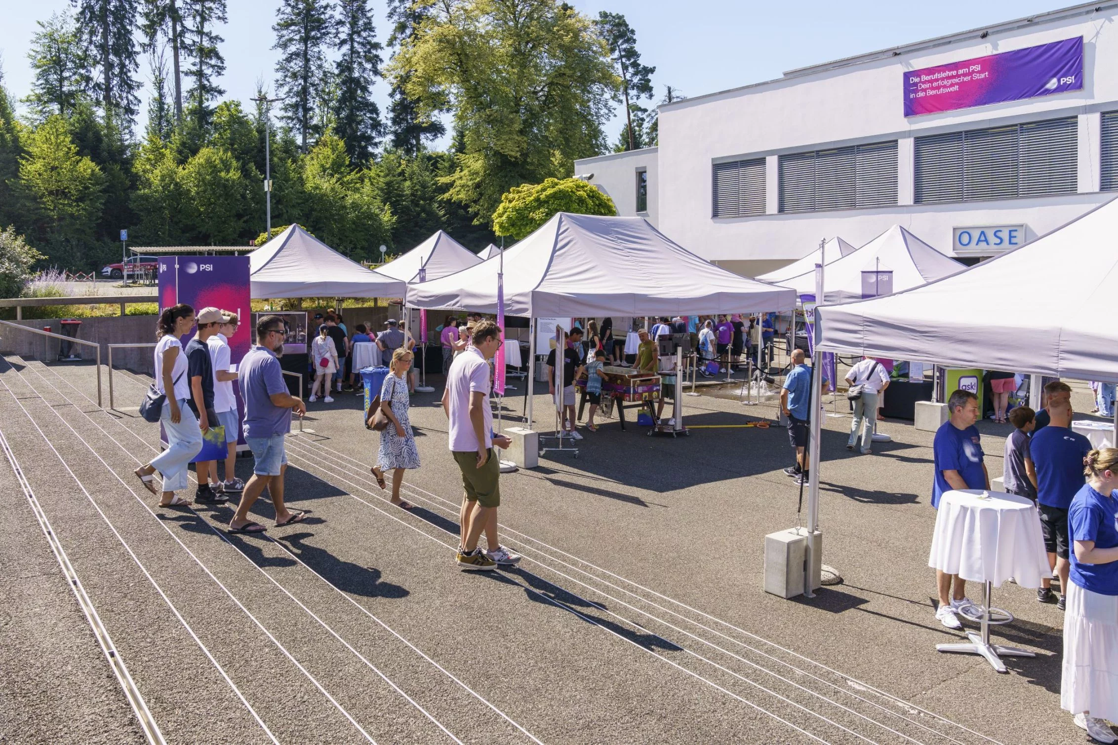 An diversen Ständen präsentierten die Lernenden unter dem Titel Lehrberufe à la carte ihre 17 Lehrberufe am PSI: authentisch, anschaulich und mit grossem Engagement. Auch das berufsübergreifende Projekt der «Töggelikasten» lockte Jung und Alt an. Trotz der grossen Hitze besuchten fast 400 Personen den Anlass.