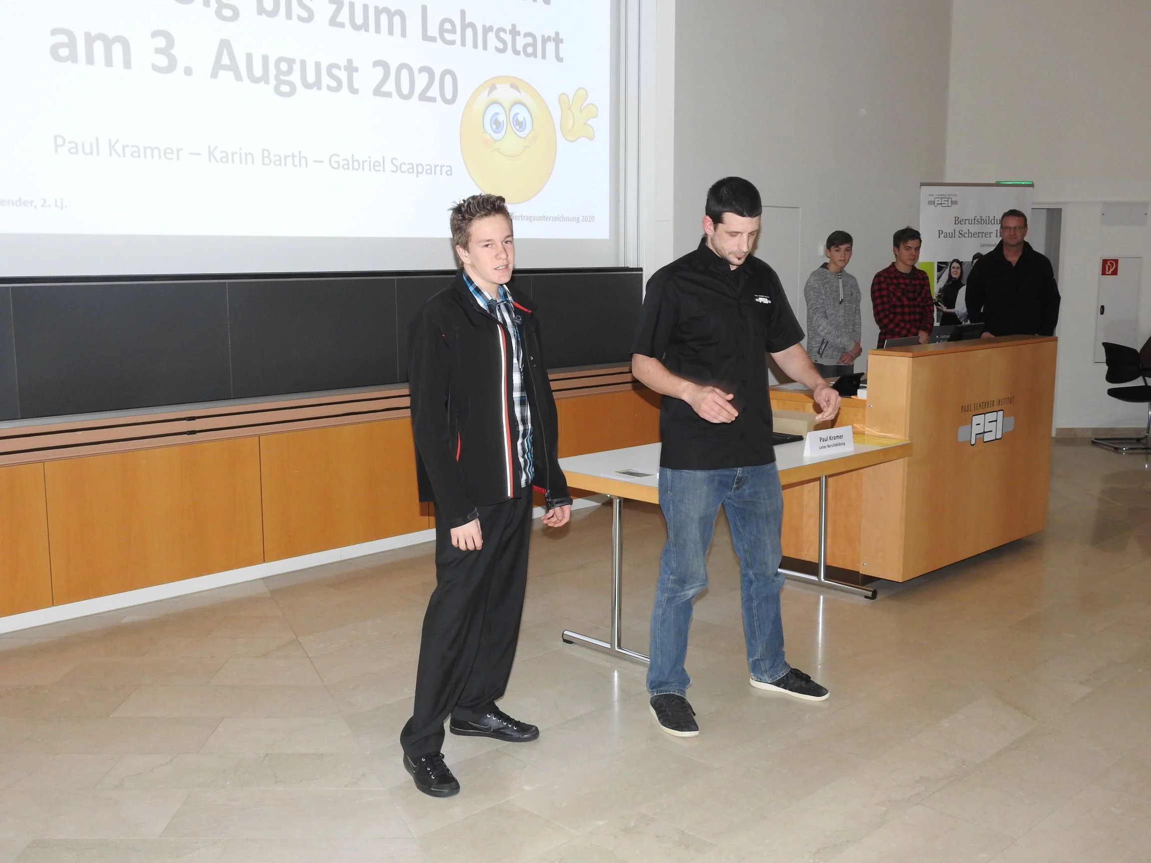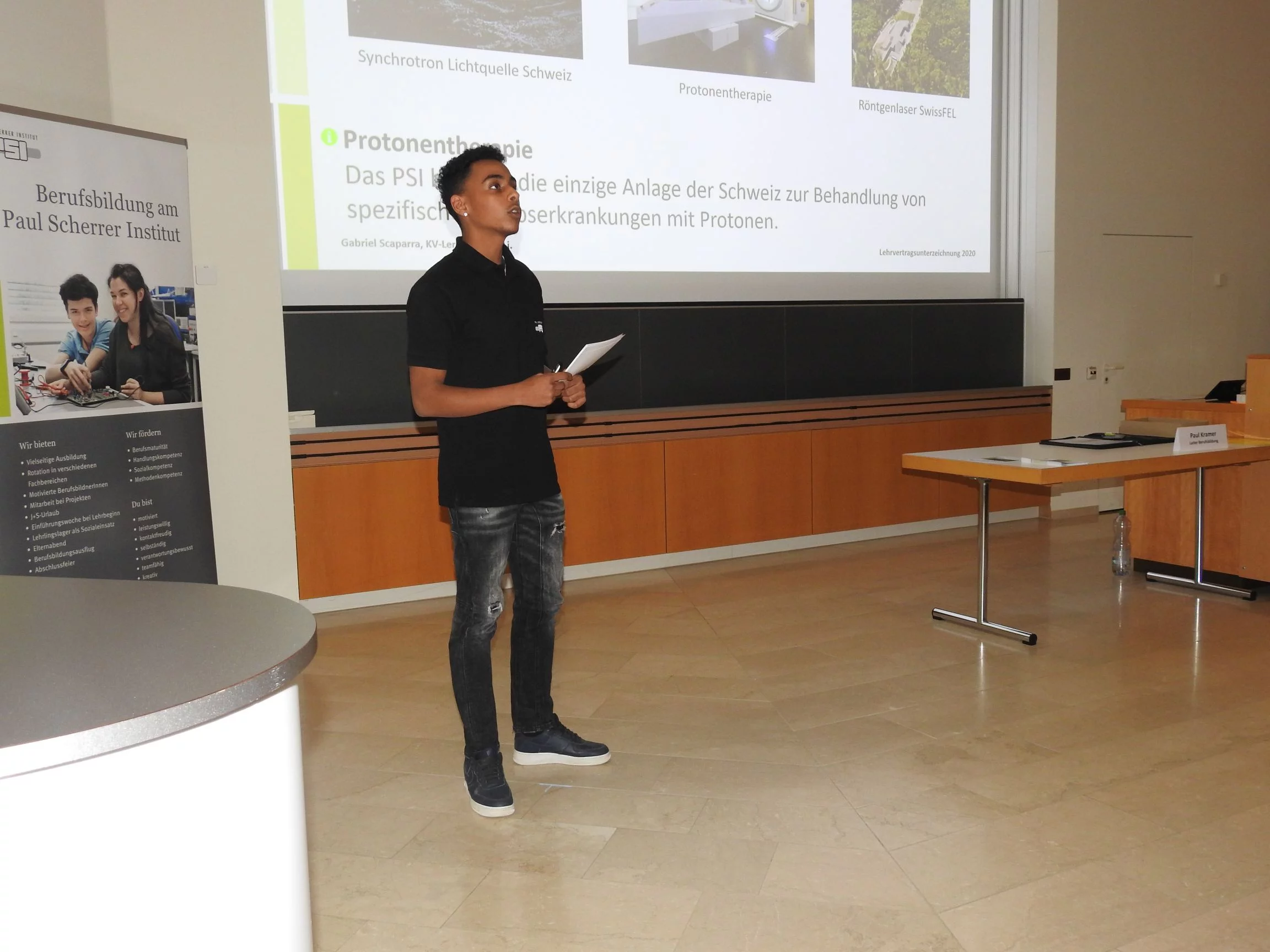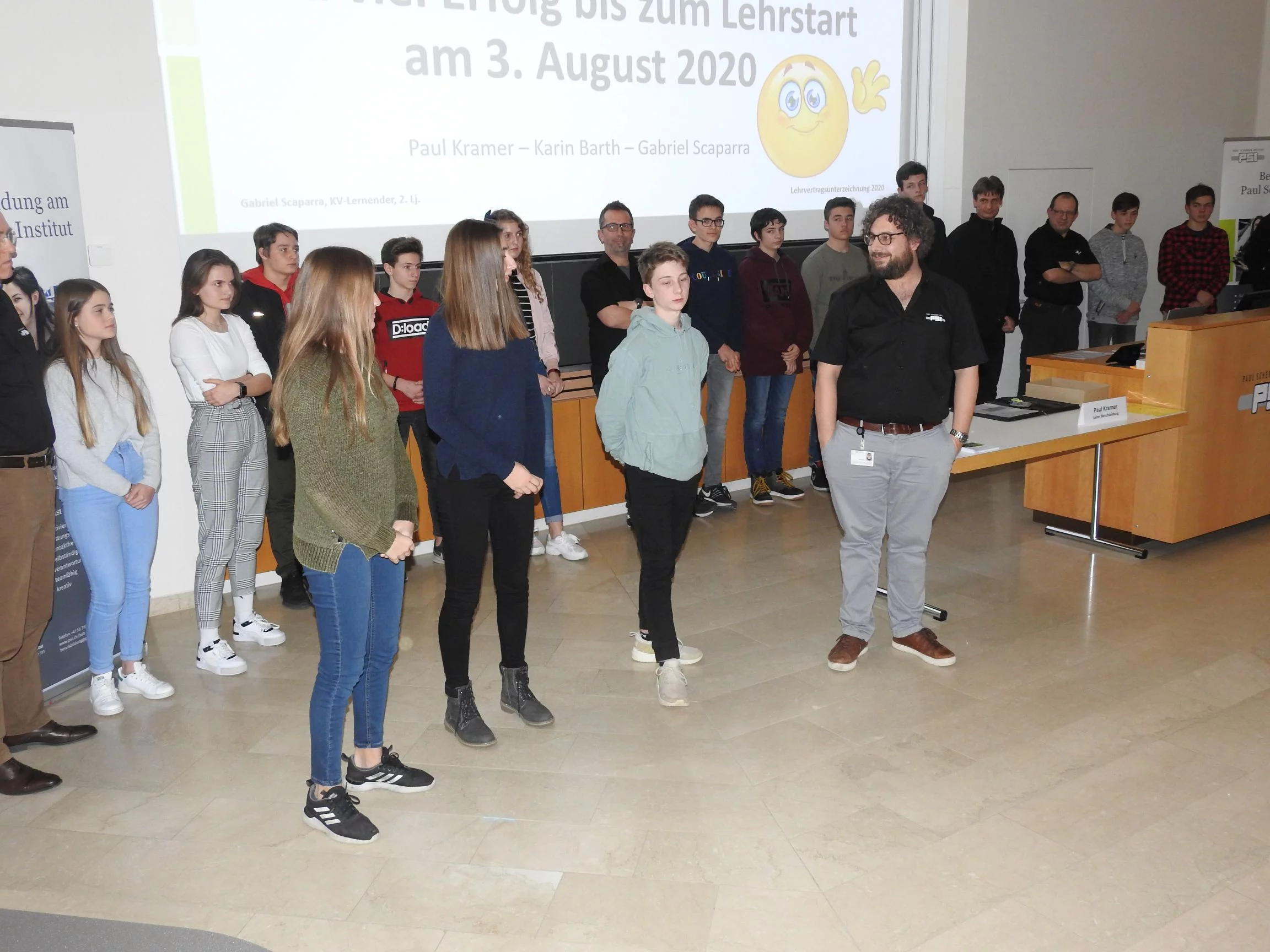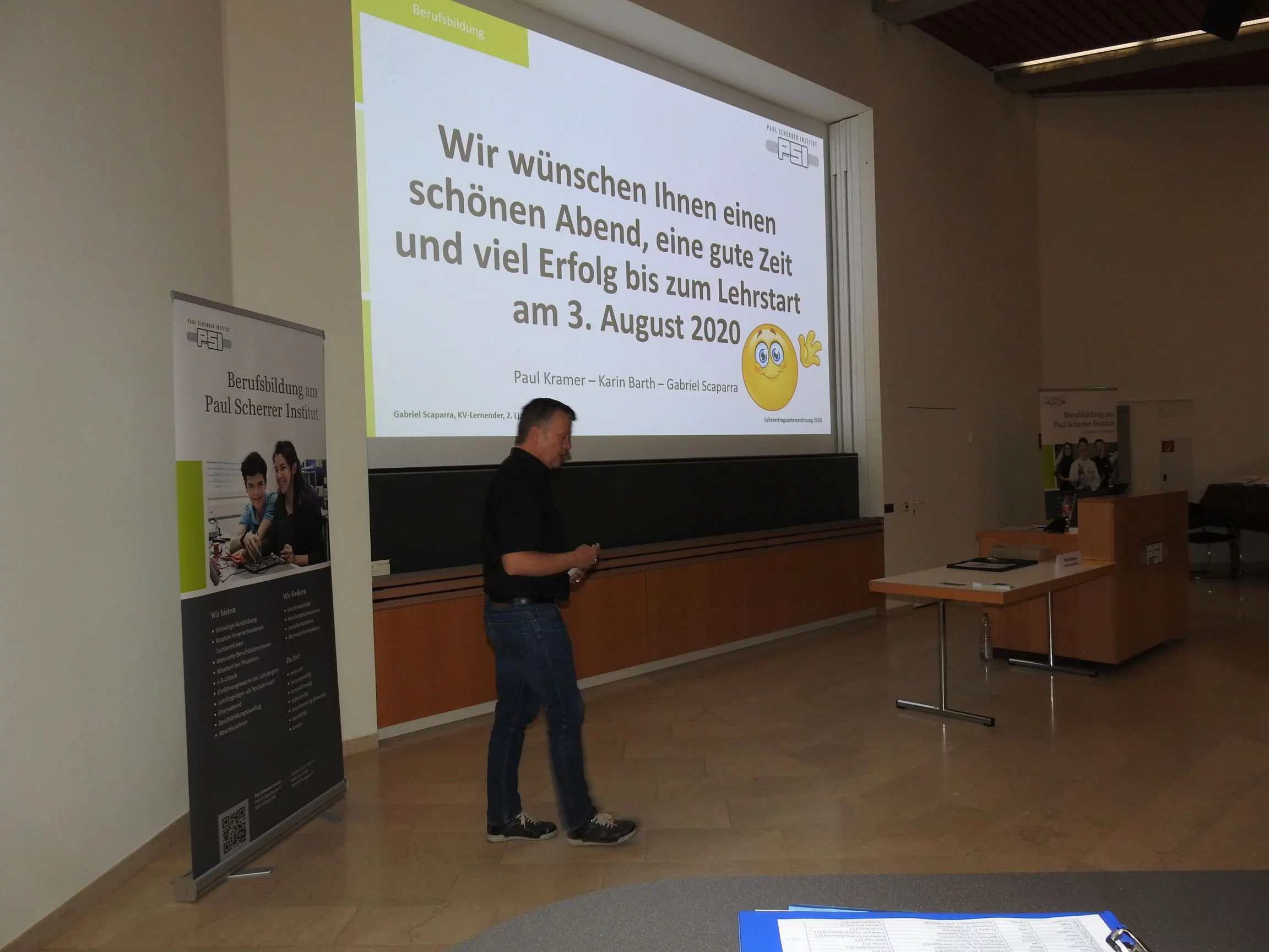 Paul Kramer begrüsste alle Lernenden und Eltern mit dem einleitenden Satz: «Auch der weiteste Weg beginnt mit dem ersten Schritt». Dieser Satz ist motivierend und bei diesem weiten Weg haben die Lernenden und Praktikantinnen unsere volle Unterstützung. Er erklärte, wie es ist, von der Oberstufe in die Lehre zu wechseln. Danach durfte Gabriel S., KV-Lernender im 2. Lehrjahr, einen Vortrag über das PSI und über die Lehre am PSI halten. Der Vortrag kostete viel Mut und Nerven laut seinen Aussagen. Danach erwähnte Paul Kramer auch, was in der Lehre alles neu ist und etwas zum Thema Selbstständigkeit, was das A und O in der Ausbildung ist. Die Berufsbildner begrüssten ihre neuen Lernenden oder Praktikantinnen und führten sie an ihre zukünftigen Arbeitsplätze, dort unterschrieben sie ihre Lehr- oder Praktikumsverträge. Abschliessend gingen alle zusammen ins Personalrestaurant Oase und genossen ein leckeres Abendessen.