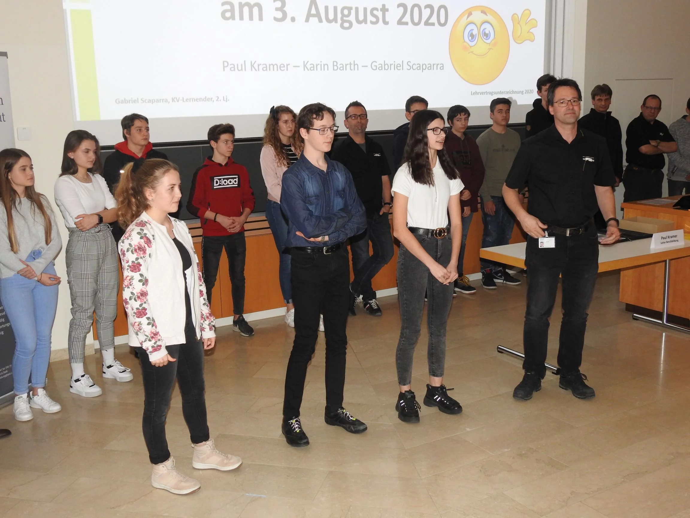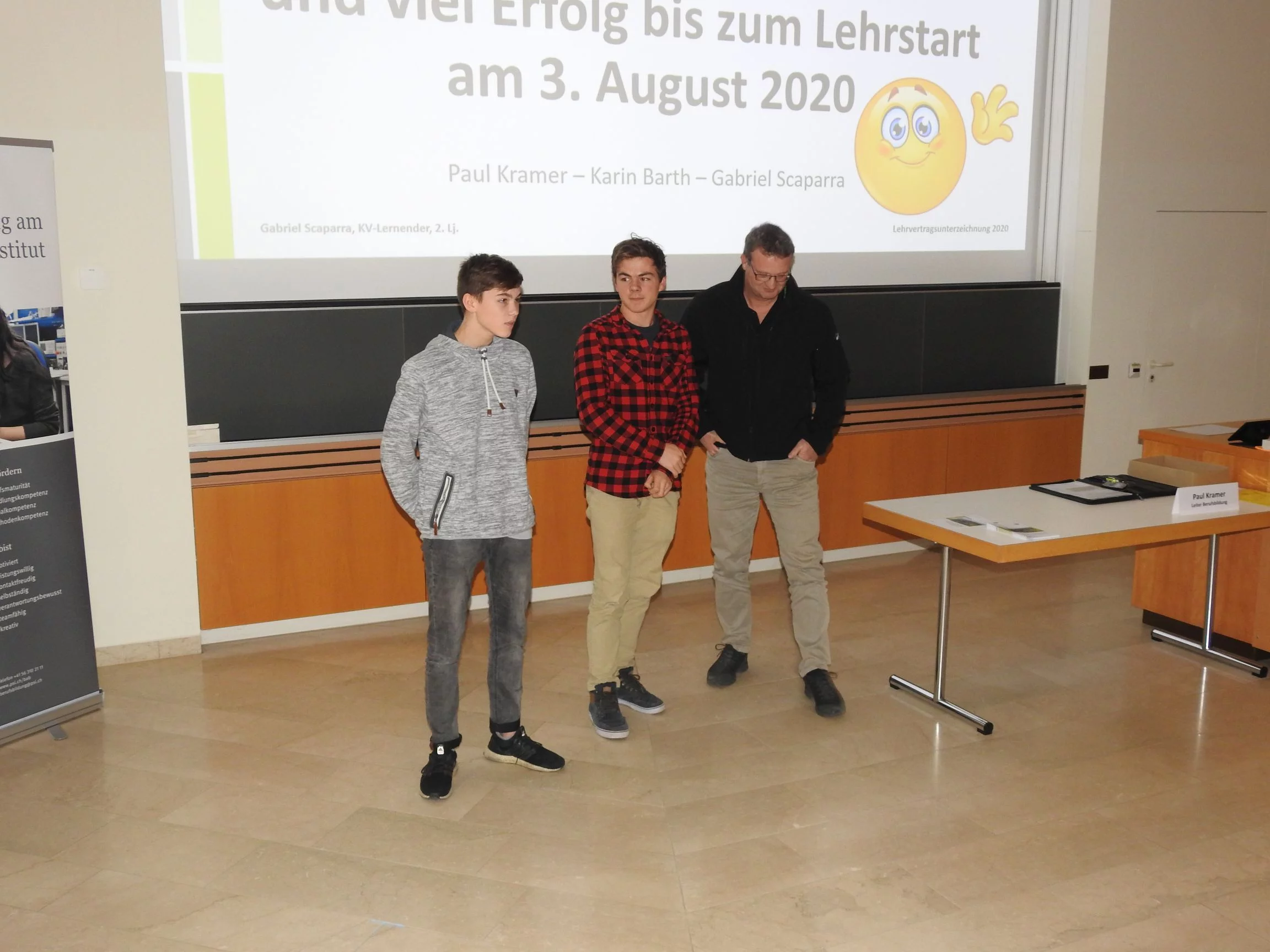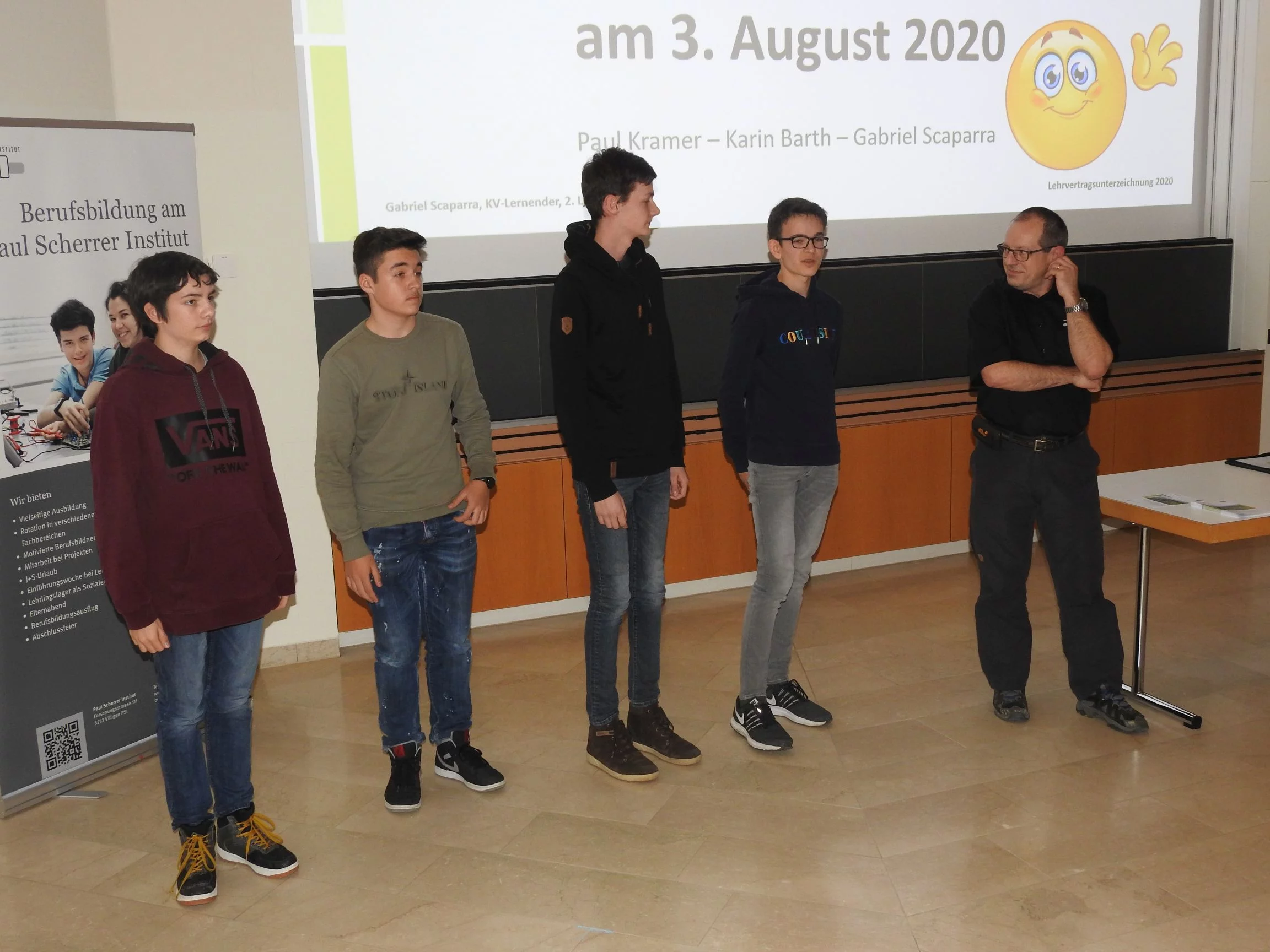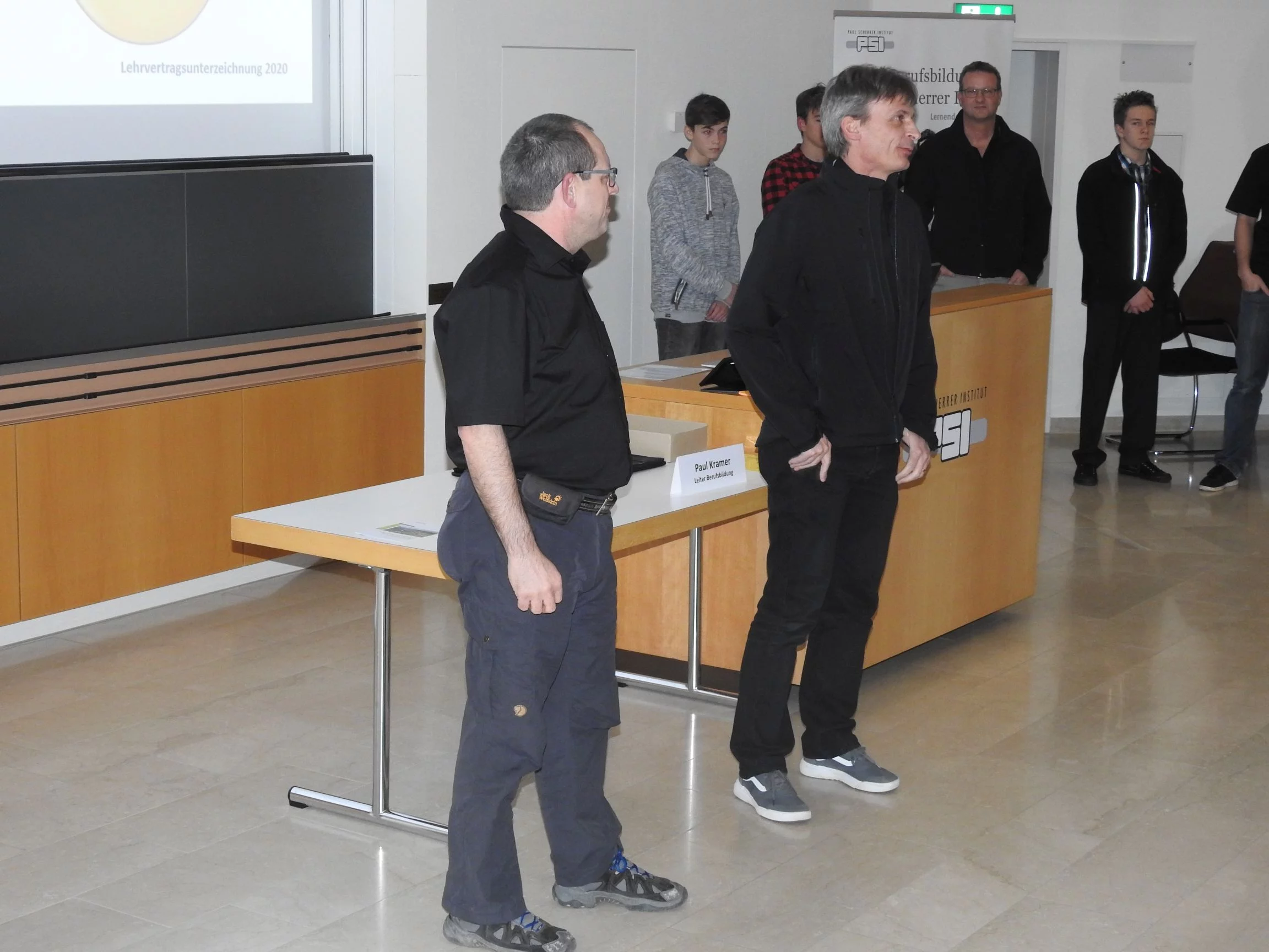 Paul Kramer begrüsste alle Lernenden und Eltern mit dem einleitenden Satz: «Auch der weiteste Weg beginnt mit dem ersten Schritt». Dieser Satz ist motivierend und bei diesem weiten Weg haben die Lernenden und Praktikantinnen unsere volle Unterstützung. Er erklärte, wie es ist, von der Oberstufe in die Lehre zu wechseln. Danach durfte Gabriel S., KV-Lernender im 2. Lehrjahr, einen Vortrag über das PSI und über die Lehre am PSI halten. Der Vortrag kostete viel Mut und Nerven laut seinen Aussagen. Danach erwähnte Paul Kramer auch, was in der Lehre alles neu ist und etwas zum Thema Selbstständigkeit, was das A und O in der Ausbildung ist. Die Berufsbildner begrüssten ihre neuen Lernenden oder Praktikantinnen und führten sie an ihre zukünftigen Arbeitsplätze, dort unterschrieben sie ihre Lehr- oder Praktikumsverträge. Abschliessend gingen alle zusammen ins Personalrestaurant Oase und genossen ein leckeres Abendessen.