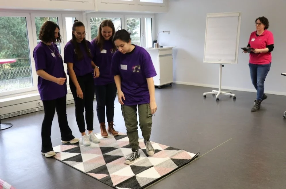 Nun waren alle Einzelaufgaben abgeschlossen und es wartete noch eine Teamaufgabe auf mich. Bei dieser mussten wir einen Teppich, auf dem wir draufstanden umkehren, ohne ihn zu verlassen. Diese Aufgabe viel mir leicht. Ich konnte meine Ideen in der Gruppe kommunizieren und argumentieren. Ich ging auf meine Teammitglieder ein und gemeinsam haben wir es geschafft den Teppich zu wenden.