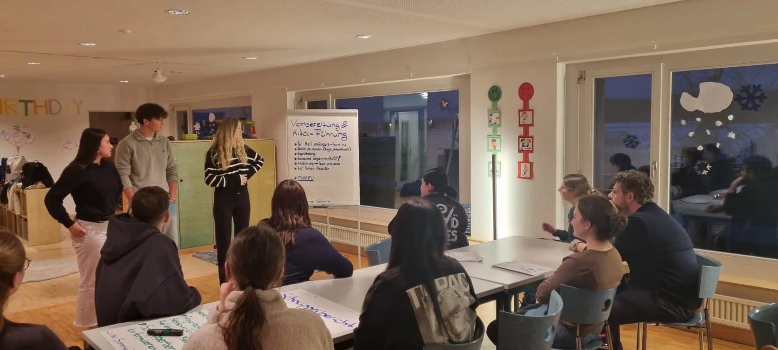 Am 05.03.2024 fand in der Kita Kiwi die XL-Ausbildungssitzung statt. Unser Thema war „Schnupperlernende korrekt begleiten“. Zur Vorbereitung haben wir alle unser Konzept „Rekrutierungsprozess Kindertagesstätte“ gelesen und allfällige Fragen notiert. Zum Start hat uns die Berufsbildnerin begrüsst und den Ablauf erklärt. Wir wurden in vier Gruppen eingeteilt und erhielten ein Flipchart. Jede Gruppe hatte ein konkretes Thema zum Bearbeiten und so konnte in den Gruppen selbst ein Erfahrungsaustausch stattfinden. Das Überthema für die Gruppenarbeiten war die Schnupperlehre in der Kita. Jede Gruppe hat der Reihe nach ihr Flipcharts im Plenum vorgestellt. Anschliessend konnten alle zwölf Lernende Ergänzungen mitteilen oder bei Unklarheiten fragen. Die Berufsbildnerin war da, um unsere Fragen zu beantworten, Ergänzungen mitzuteilen und betonte auch, was ihr wichtig ist.