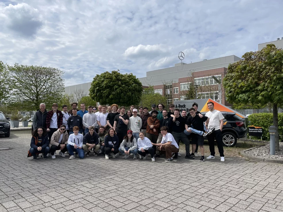 Um acht Uhr morgens trafen sich die Schüler in Baden und fuhren mit dem Car Richtung Rastatt los. Nach einer leckeren Pizza stand nun eine Führung durch das Mercedes-Benz Werk auf dem Tagesplan. Die Automatiker bestaunten die vielen Roboter bei ihrer effizienten Arbeit. Autoteile wurden zusammengefügt und anschliessend verschweisst. In der nächsten Halle sah man schon die lackierten Autos auf den Förderbändern. Mechaniker verdrahteten die Elektronik oder weitere Roboter bestückten die Mercedes in der sogenannten «Hochzeit» mit dem Motor. In einem Video wurde über die sorgfältige Lackierung gesprochen, denn auf Grund der Sicherheitsmassnahmen ist es nicht erlaubt, dies live zu besichtigen.