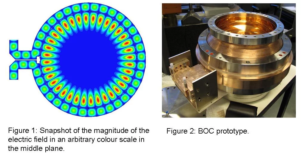 The SwissFEL C-band (5.712 GHz) linac consists of 26 RF modules. Each module is composed of a single 50 MW klystron feeding a pulse compressor and four two meter long accelerating structures. The pulse compressor is a passive device that compresses in time the 3 μs pulse from klystron into a 330 ns pulse. The compressed power is then guided to the four accelerating structures. The pulse compressor is based on a single Barrel Open Cavity (BOC). The BOC makes use of a “whispering gallery” mode which has an intrinsically high quality factor and operates in resonant rotating wave regime (Figure 1); moreover, and contrary to the conventional SLED scheme, a single cavity is sufficient to define the pulse compressor, without the need for two cavities. A prototype has been manufactured by the Dutch company VDL (Figure 2) and successfully power tested in PSI reaching a peak power of 300 MW.