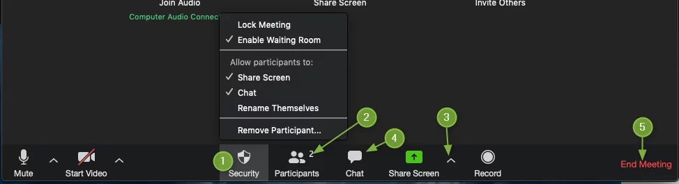 - Aktivieren Sie Wartezimmer (auch verfügbare Steuerelemente für Sicherheitsbesprechungen verfügbar). Beachten Sie, dass ein zusätzlicher Schritt erforderlich ist, um jeden Teilnehmer zuzulassen