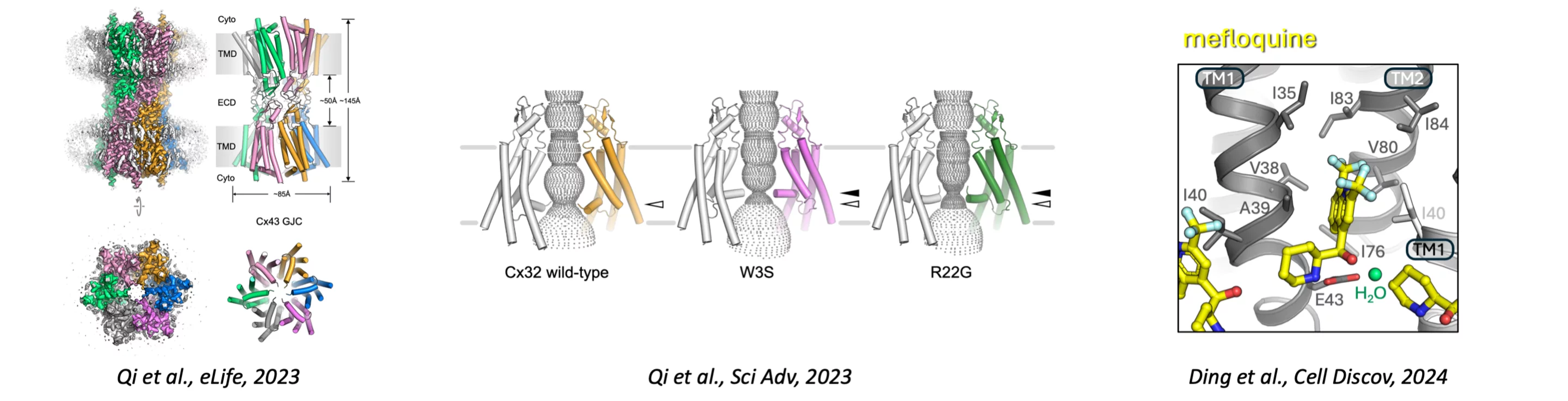 Gap junction channels (GJCs), formed by connexins, facilitate intercellular communication by linking connexin hemichannels (HCs) on adjacent cells. These channels enable direct metabolic and electrical coupling between cells across various tissues, playing essential roles in numerous physiological and pathological processes. Using cryo-EM analysis combined with biochemistry, cell biology, and electrophysiology approaches, we investigate the molecular mechanisms underlying connexin channel function. Key findings include: (i) the structure of Cx43 in a closed state (Qi, Acosta Gutierrez et al., 2023), (ii) structural characterization of wild-type and Charcot-Marie-Tooth disease-linked mutants of Cx32 GJCs and HCs (Qi, Lavriha, Bayraktar et al., 2023), and (iii) identification of a novel mode of small molecule-mediated inhibition of Cx36 GJCs (Ding, Aureli et al., 2024). These studies provide valuable insights into connexin channel regulation and their roles in health and disease.
