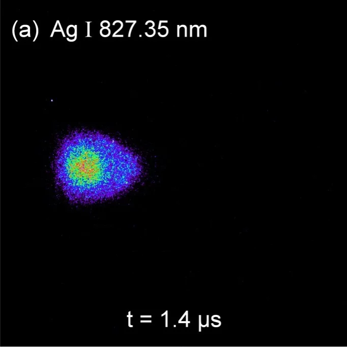 In addition to the frequency, time and space resolved spectroscopy, we do time, space and frequency resolved imaging. One example is shown in the following animation where the plasma expansion of silver was recorded between the initial impact of the laser beam on the target and 10µsec after with a time resolution of 500nsec for each frame. After approx. 2µsec a rebound of the impinging Ag species from the heater is observed. These rebounded species travel back even as far as the target.