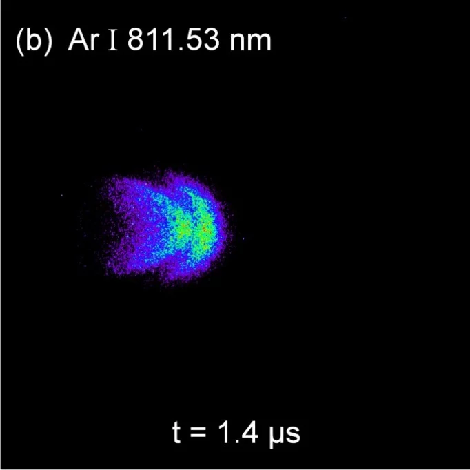 As an example of selected line imaging using an AOTF, the next images show the spatial distributions of Ag and Ar excited neutrals at the same time frame of 1.4µs. The AOTF selected optical excitation lines were 827.35 nm for Ag I and 811.53 nm for Ar I. For each image 100 accumulations were used to increase image resolution. The gradients are normalized to the maximum counts for each image. More details can be found in J. Appl. Phys. 120, 225301 (2016).