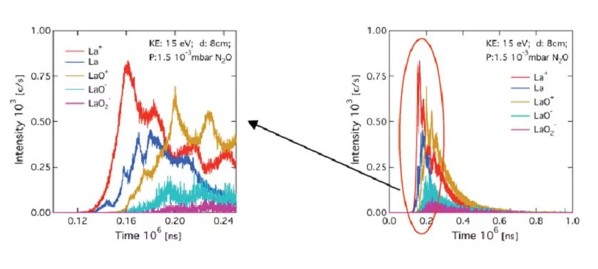 Kinetic energy distributions for LaO+ in vacuum, O2, and N2O.