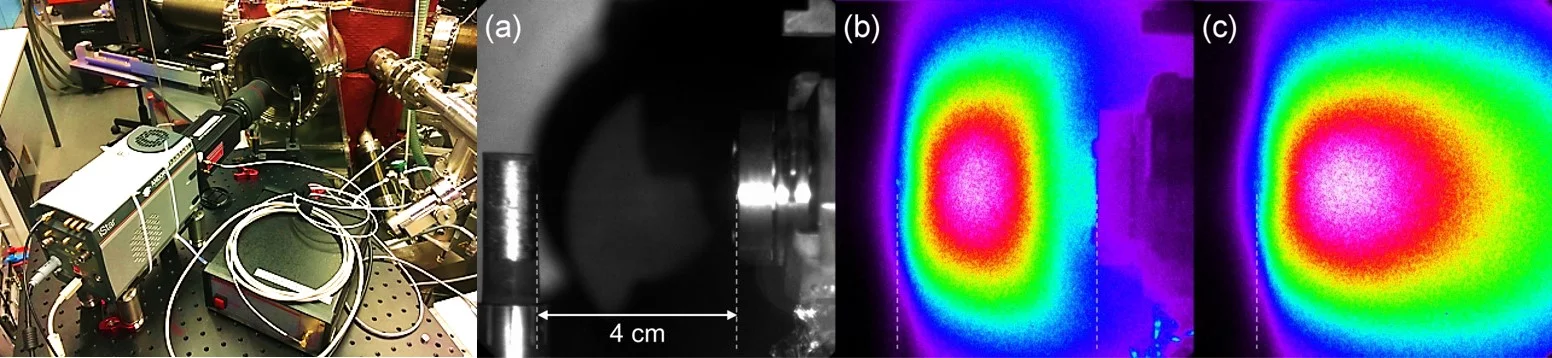 The plasma imaging set-up is shown in the left image. A high speed gated ICCD camera (Andor New i-star) is used to record the time evolution of the ablated material. The images are recorded for either all light admitted through a quartz window (200nm-1000nm) or for selected wavelengths using an Acousto-optic tunable filter (AOTF, 400-1000 nm). The Brimrose models VA210-0.55-1.0-H and VA210-0.40-0.65-H) has a wavelength resolution of 0.6-3 nm with a manufacturer certified resolution of 1.3 nm at 633 nm. An image of an experimental arrangement (cylindrical Ag target with a target-heater/MS distance of 4cm is shown (Fig. (a)), followed by an all light image of the expanding plasma with (b) and without (c) heater. Images by Yao Xiang and Alejandro Ojeda.