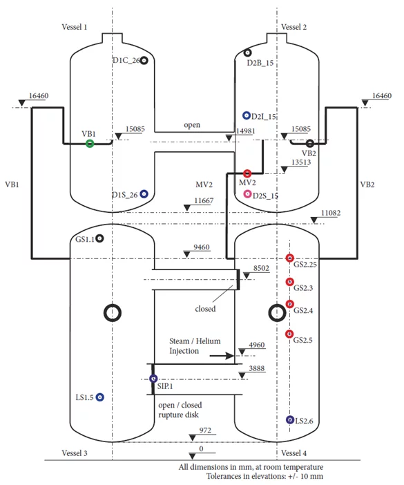 In Figure 2 is shown a 3D rendering of the PANDA facility configuration used for the HP6 series, and red are identified the new lines and components were implemented based on the above step 2. In Figure 3 is a 2D schematic with the locations of selected sensors used to characterize the test phenomenology.