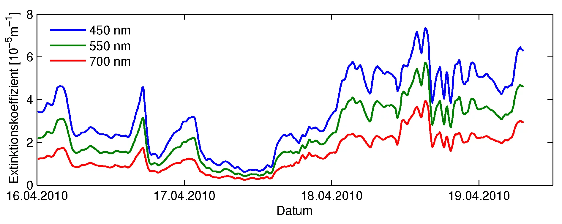 Die Kombination der erhobenen Daten erlaubt es nun aber, das Verhältnis der Massenkonzentration zum Extinktionskoeffizienten zu bestimmen, und so die Lidar-Daten auf Vertikalprofile der Massenkonzentration umzurechnen. Auch andere Grössen, wie zum Beispiel die Konzentration der grösseren Partikel, die durch Messungen der Schweizer Firma Metair während des letzten Wochenendes mit einem Motorsegelflugzeug bestimmt wurden, lassen sich so auf eine Massenkonzentration umrechnen. Damit wird eine räumliche Übersicht über diese Massenkonzentration möglich.