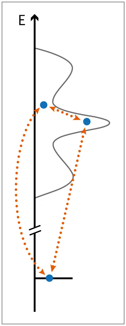 In ihren Experimenten untersuchten die Forschenden die Physik um das Eisenatom herum. «Ein Vorteil von RIXS ist, dass man sich auf eine bestimmte Komponente konzentrieren und diese genau für Materialien untersuchen kann, die aus mehreren Elementen bestehen», sagt Schmitt. Der fein abgestimmte Röntgenstrahl bewirkt, dass beim Eisenatom ein inneres Elektron vom Grundzustand im Rumpfniveau ins darüber liegende, nur teilweise besetzte Valenzband angehoben wird. Diese Anregung des zentralen Elektrons kann weitere sekundäre Anregungen verursachen und viele komplizierte Zerfallsprozesse auslösen, die sich schliesslich in spektralen Satelliten-Strukturen manifestieren (siehe Grafik).