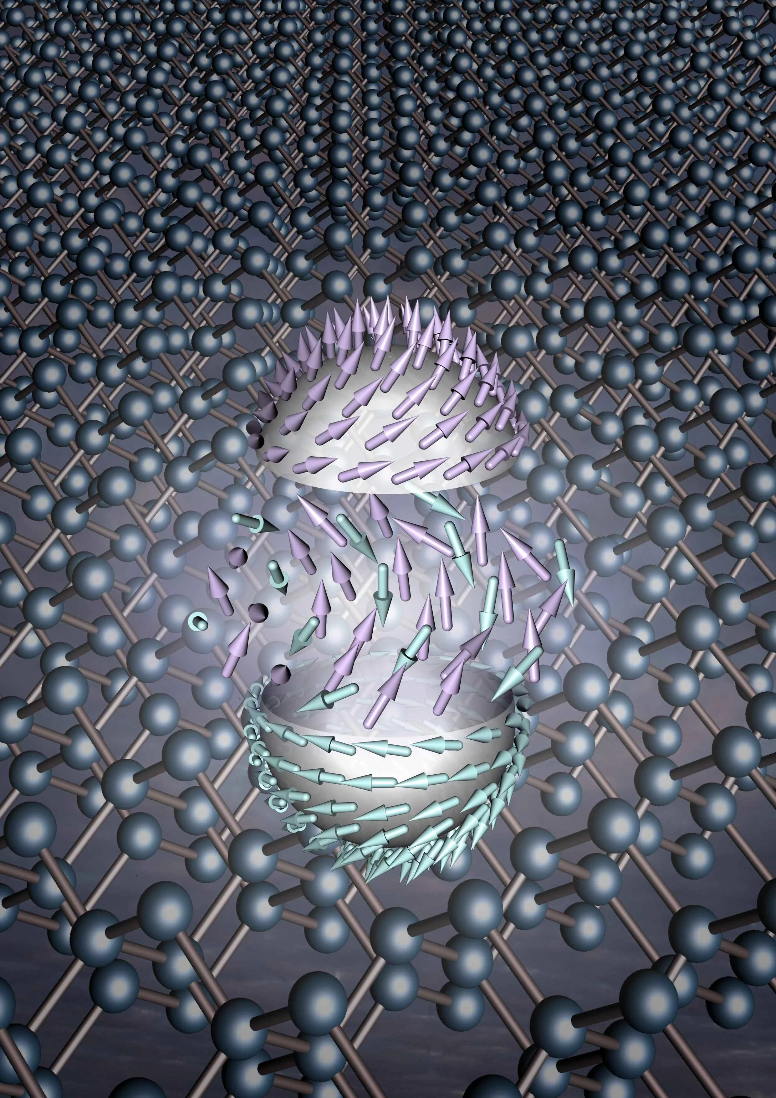 Unter gewissen Umständen ist es möglich, in dem Heer der Spins winzige Wirbel zu erzeugen: sogenannte Skyrmionen. Forschende interessieren sich für Skyrmionen, da diese für zukünftige Technologien, beispielsweise effizientere Computer, eine Rolle spielen könnten. So könnten Skyrmionen als Speicher-Bits genutzt werden: Ein Skyrmion könnte eine digitale 1 darstellen, sein Fehlen eine 0. Da Skyrmionen deutlich kleiner sind als die Bits bisheriger Speichermedien, liessen sich Daten enger packen als bisher – und womöglich auch energieeffizienter sowie schneller schreiben und lesen. Sowohl für die klassische Datenverarbeitung als auch für Quantencomputer könnten Skyrmionen deshalb von Nutzen sein.