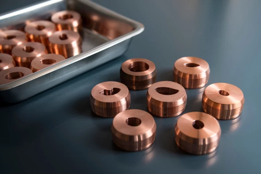 Die Lochblenden, wie die Kollimatoren auch genannt werden, sind eine Massanfertigung. Sie werden in den Werkstätten des PSI gefrässt und für jeden Patienten und jede Patientin individuell hergestellt. Die in der Form des Tumors gefräste Blende ermöglicht, dass der Protonenstrahl nur auf den Augentumor trifft und das übrige gesunde Gewebe des Auges nicht bestrahlt wird.