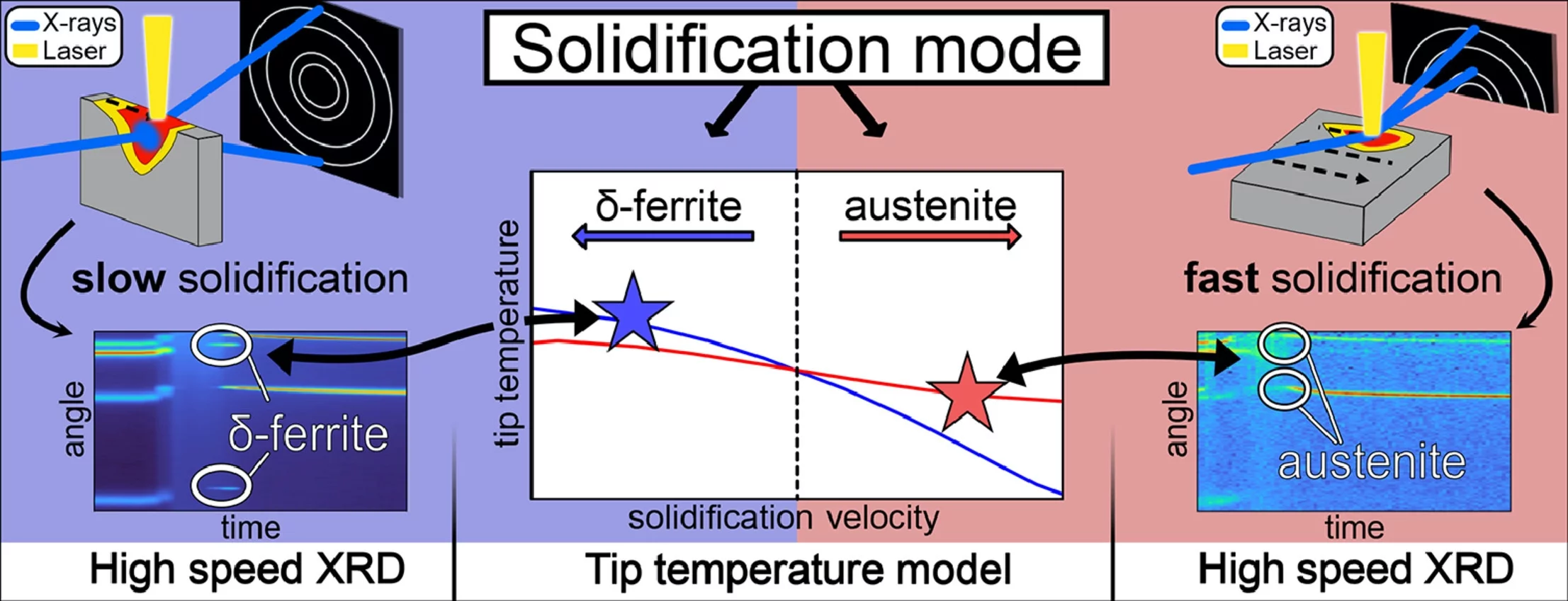 The solidification mode of primary δ-ferrite is observed at a cooling rate of 2.12 × 104 K/s, whereas at a higher cooling rate of 1.5 × 106 K/s, δ-ferrite is suppressed, and primary austenite is observed. The experimental thermal conditions are evaluated and linked to a Kurz-Giovanola-Trivedi (KGT) based solidification model. The modelling results show that the predictions from the multicomponent KGT model agree with the experimental observations. This work highlights the role of in situ XRD measurements for a fundamental understanding of the microstructure evolution during AM and for validation of computational thermodynamics and kinetics models, facilitating parameter and alloy development for AM processes.