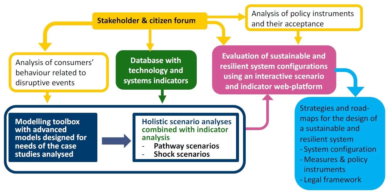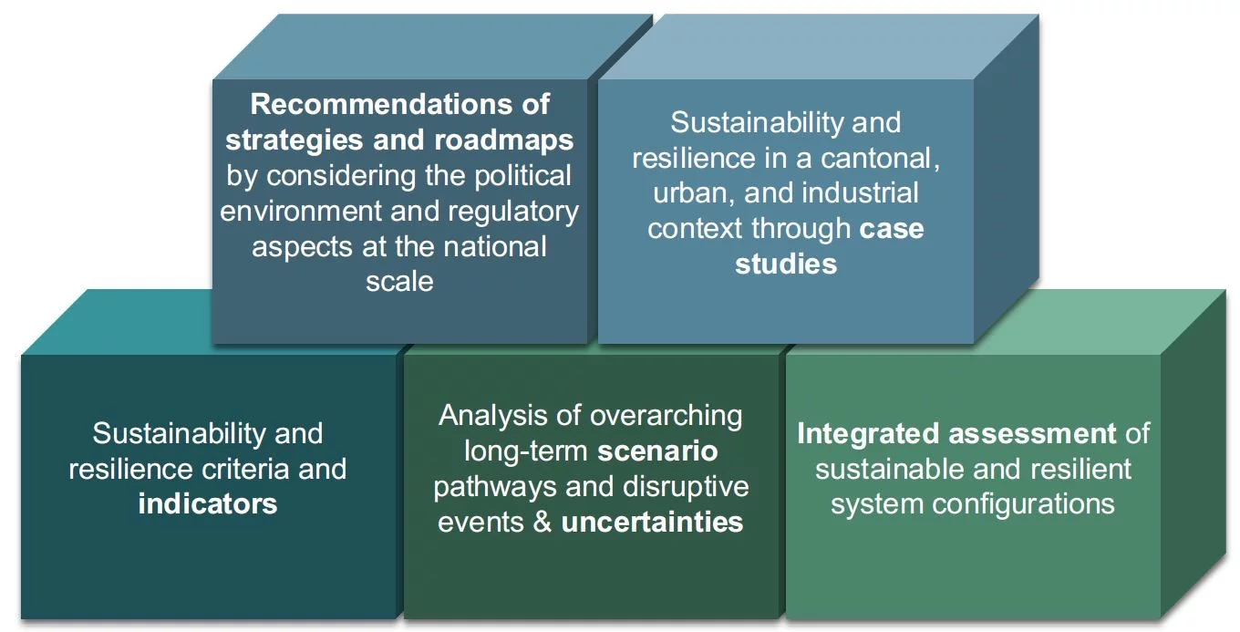As shown in Figure 2, the SURE project structure and analytical framework tackles several research areas related to the reconciliation of resilience and sustainability criteria with the main goals of the Swiss energy sector transformation:
