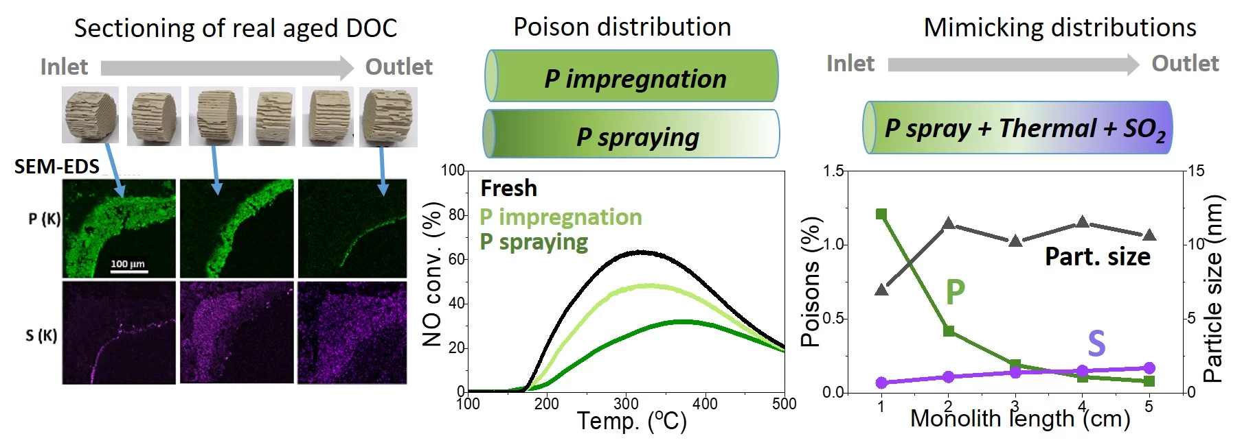 In the second part of the project focusing on artificial catalyst aging, the unused DOC was exposed to sequential poisoning and thermal treatments. Chemical poisoning was obtained by spraying a solution of the P precursor onto the catalyst and by adding SO2 to the feed gas. The conditions of the treatments were optimised to mimic – as close as practically possible – the poison content/distribution along the length and the thickness of the washcoat as well as the noble metal particle sizes observed in vehicle aged DOC. This approach allowed evaluating the individual impact of each treatment while setting the basis for future protocols for lab scale durability predictions.