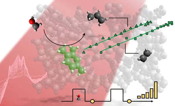 The interrelationship between the selectivity in the MTO process, the zeolite topology and the presence of specific carbenium ions was clarified in this work. This information can then guide in the choice and design of zeolite/carbenium ion systems for a specific olefin selectivity.