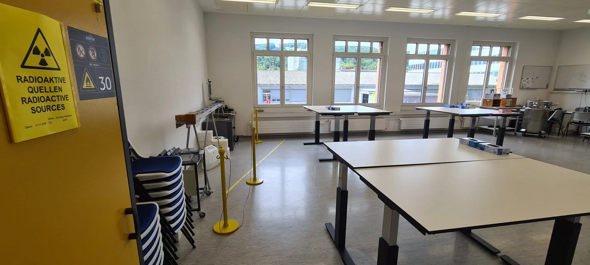 A C-lab with chapels and additional workstations for 16 persons is available for work with open radioactive sources (e.g., Tc-99m). Additionally, 16 work stations are available to experiment with closed radioactive sources, including determination of decay types, shielding, and gamma spectroscopy.