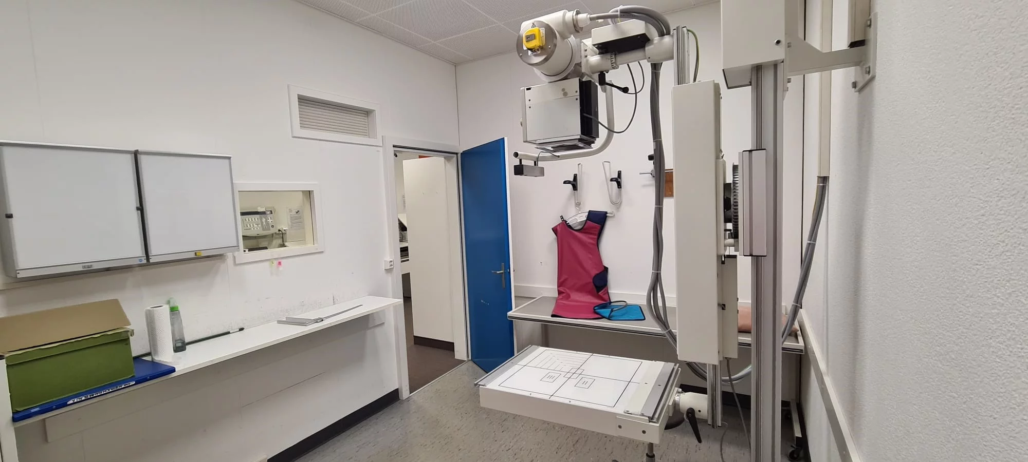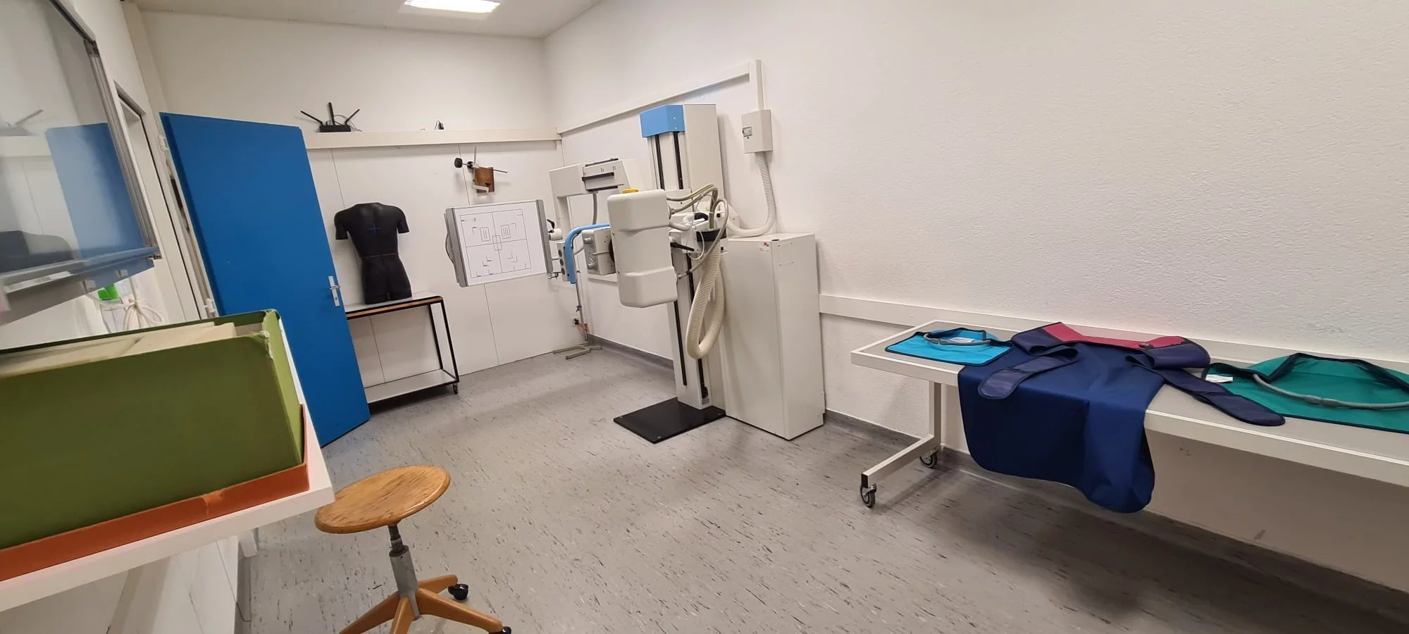 Our course participants use the largest digital X-ray laboratory in Switzerland. In the fully equipped training hospital, there are a total of 3 X-ray systems with practical equipment as well as 7 additional X-ray systems for experiments. Using numerous phantoms such as the skull, spine, pelvis, thorax, hand and foot, comparisons of image quality and dose can be made.