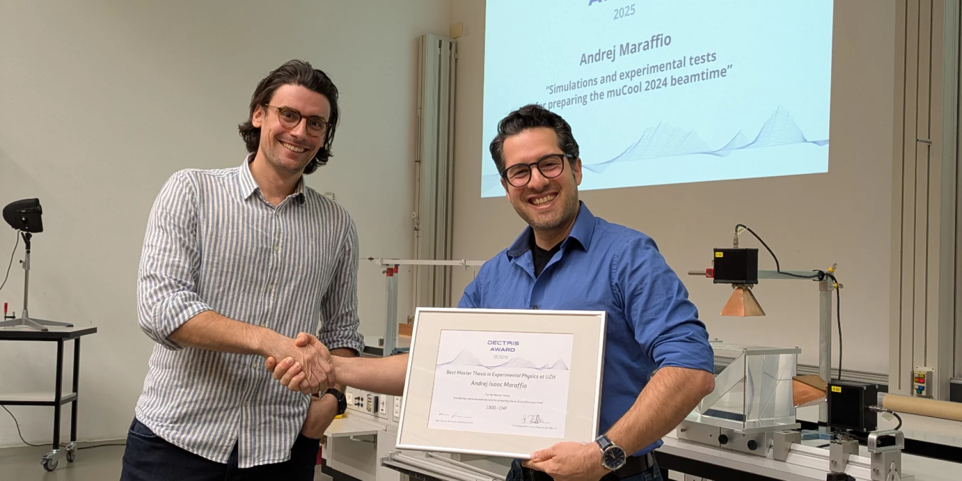 Congratulations to Andrej Maraffio for winning the Dectris Prize 2025 for this year's best experimental Master thesis at the Physics Institute at the University of Zurich. His Master thesis entitled 'Simulations and experimental tests for preparing the muCool 2024 beamtime‘ was carried out at PSI under the supervision of Aldo Antognini and Lea Caminada.