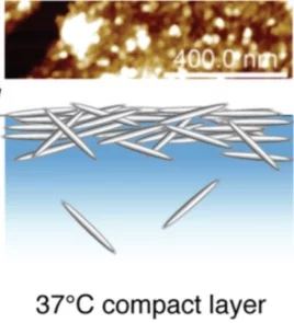 The mechanical performance of materials at oil/water interfaces after consumption is a key factor affecting hydrophobic drug release. In this study, we methylated the surface of nanocrystalline cellulose (NCC) by mercerization and dimethyl sulfate exposure to produce thermosensitive biopolymers. These methylated NCC (metNCC) were used to investigate interfacial thermogelation at air/water and medium-chain triglyceride (MCT)/water interfaces at body temperature. In contrast to bulk fluid dynamics, elastic layers were formed at room temperature, and elasticity increased significantly at body temperature, which was measured by interfacial shear and dilatational rheology in situ. This unique phenomenon depends on solvent quality, temperature, and polymer concentration at interfaces. Thus, by adjusting the degree of hydrophobicity of metNCC, the interfacial elasticity and thermogelation of the interfaces could be varied. In general, these new materials (metNCC) formed more brittle interfacial layers compared to commercial methylcellulose (MC A15). Thermogelation of methylcellulose promotes attractive intermolecular forces, which were reflected in a change in self-assembly of metNCC at the interface. As a consequence, layer thickness and density increased as a function of temperature. These effects were measured by atomic force microscopy (AFM) images of the displaced interface and confirmed by neutron reflection. The substantial structural and mechanical change of methylcellulose interfaces at body temperature represents a controllable encapsulation parameter allowing optimization of lipid-based drug formulations.