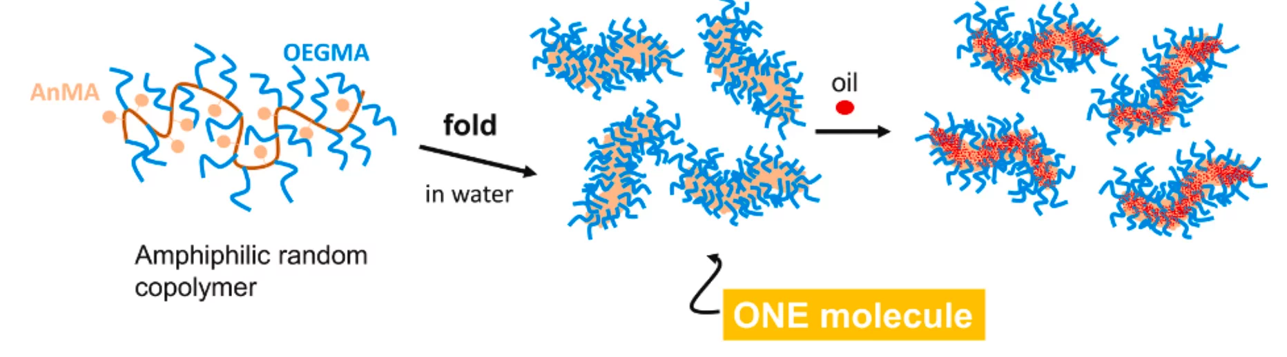 We report on the oil solubilization of amphiphilic single chain nanoparticles (SCNPs) based on random copolymers composed of oligo(ethyleneglycol) methacrylate (OEGMA) and anthracene methacrylate (AnMA). Small-angle X-ray scattering (SAXS) combined with molecular dynamics simulations reveal that the copolymers self-assemble into single-chain nanoparticles resembling flexible cylinders, driven by the intra-molecular association of anthracene moieties.
