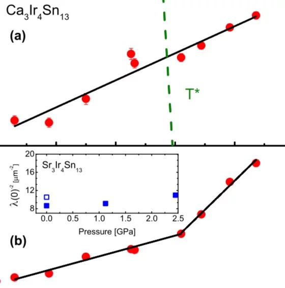 We report microscopic studies by muon spin rotation/relaxation as a function of pressure of the Ca3Ir4Sn13 and Sr3Ir4Sn13 cubic compounds, which are members of the (Ca1−xSrx)3Ir4Sn13 system displaying superconductivity and a structural phase transition associated with the formation of a charge density wave (CDW). We find a strong enhancement of the superfluid density and a dramatic increase of the pairing strength above a pressure of ≈1.6 GPa, giving direct evidence of the presence of a quantum critical point separating a superconducting phase coexisting with CDW from a pure superconducting phase. The superconducting order parameter in both phases has the same s-wave symmetry. In spite of the conventional phonon-mediated BCS character of the weakly correlated (Ca1−xSrx)3Ir4Sn13 system, the dependence of the effective superfluid density on the critical temperature puts this compound in the 'Uemura' plot close to unconventional superconductors. This system exemplifies that conventional BCS superconductors in the presence of competing orders or multiband structure can also display characteristics of unconventional superconductors.