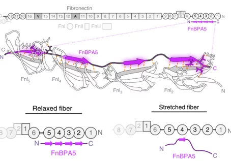 The tumor microenvironment (TME) has emerged as an attractive diagnostic or therapeutic target. The TME consists of malignant cells and a diverse population of non-malignant components, including immune cells, cancer-associated fibroblasts (CAFs), and endothelial cells (ECs), all embedded within a complex extracellular matrix (ECM) composed of fibronectin, collagen, elastin, and laminin. Remodeling of the ECM is a hallmark of tumor progression, yet the mechanisms by which interactions of cancer cells and ECM drive these changes is not fully understood. Previously, we introduced a novel nanoprobe to assess mechanical strain in fibronectin (Fn) fibers in situ, utilizing the bacterial fibronectin-binding peptide FnBPA5 [Arnoldini et al., 2017. Nat Commun] (Fig. 8).