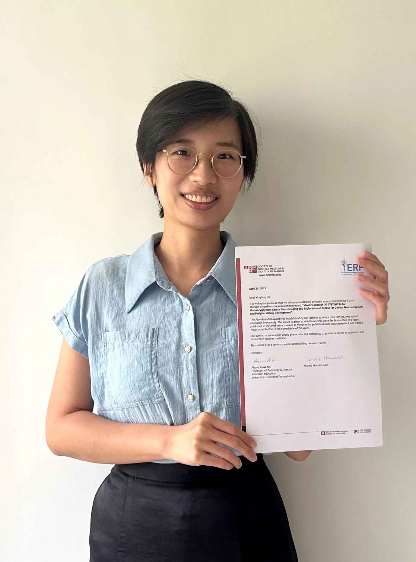 Dr. Yingfang He has been honoured with the Alavi-Mandell Award from the Journal of Nuclear Medicine (JNM) and the Society of Nuclear Medicine and Molecular Imaging (SNMMI) for her publication “Identification of (R)-[18F]YH134 for Monoacylglycerol Lipase Neuroimaging and Exploration of Its Use for Central Nervous System and Peripheral Drug Development”. (Journal of Nuclear Medicine 2024 Feb 1;65(2):300-305. DOI: external pagehttps://pubmed.ncbi.nlm.nih.gov/38164615). The award is given to individuals who were the first author of a paper published in the JNM and made a major contribution to the completion of the work.