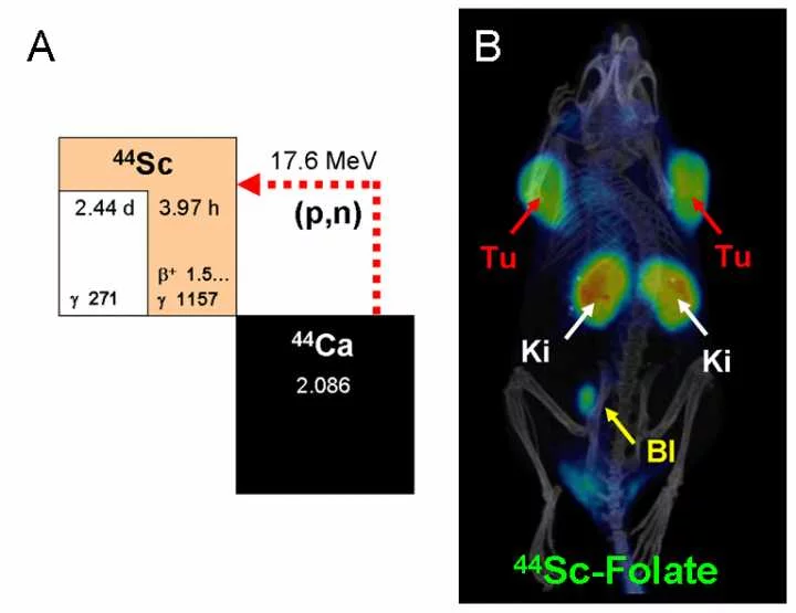 Research Division Biology and Chemistry (BIO), Folate Receptor Targeting Group, Head Cristina Müller. In recent years, implementation of 68Ga-radiometalated peptides for PET imaging of cancer has attracted the attention of clinicians. Herein, we propose the use of 44Sc (half-life = 3.97 h, average β+ energy [Eβ+av] = 632 keV) as a valuable alternative to 68Ga (half-life = 68 min, Eβ+av = 830 keV) for imaging and dosimetry before 177Lu-based radionuclide therapy. The aim of the study was the preclinical evaluation of a folate conjugate labeled with cyclotron-produced 44Sc and its in vitro and in vivo comparison with the 177Lu-labeled pendant. Methods: 44Sc was produced via the 44Ca(p,n)44Sc nuclear reaction at a cyclotron (17.6 ± 1.8 MeV, 50 μA, 30 min) using an enriched 44Ca target (10 mg 44CaCO3, 97.00%). Separation from the target material was performed by a semiautomated process using extraction chromatography and cation exchange chromatography. Radiolabeling of a DOTA-folate conjugate (cm09) was performed at 95°C within 10 min. The stability of 44Sc-cm09 was tested in human plasma. 44Sc-cm09 was investigated in vitro using folate receptor–positive KB tumor cells and in vivo by PET/CT imaging of tumor-bearing mice Results: Under the given irradiation conditions, 44Sc was obtained in a maximum yield of 350 MBq at high radionuclide purity (>99%). Semiautomated isolation of 44Sc from 44Ca targets allowed formulation of up to 300 MBq of 44Sc in a volume of 200–400 μL of ammonium acetate/HCl solution (1 M, pH 3.5–4.0) within 10 min. Radiolabeling of cm09 was achieved with a radiochemical yield of greater than 96% at a specific activity of 5.2 MBq/nmol. In vitro, 44Sc-cm09 was stable in human plasma over the whole time of investigation and showed folate receptor–specific binding to KB tumor cells. PET/CT images of mice injected with 44Sc-cm09 allowed excellent visualization of tumor xenografts. Comparison of cm09 labeled with 44Sc and 177Lu revealed almost identical pharmacokinetics. Conclusion: This study presents a high-yield production and efficient separation method of 44Sc at a quality suitable for radiolabeling of DOTA-functionalized biomolecules. An in vivo proof-of-concept study using a DOTA-folate conjugate demonstrated the excellent features of 44Sc for PET imaging. Thus, 44Sc is a valid alternative to 68Ga for imaging and dosimetry before 177Lu-radionuclide tumor therapy.