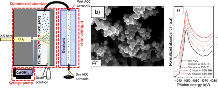 We have developed a reproducible aerosol-based synthesis method for obtaining additive-free ACC samples with enhanced stability against humidity-induced crystallization. Here we use a spray of micrometer sized aerosols from a calcium hydroxide solution, which reacts quickly with CO2. Fast drying of the reacted droplets while still airborne produces pure and clean ACC particles, which are stable against crystallization for a period of days. The stability of these ACCs have been studied by time-resolved in situ techniques including XAS and FTIR.