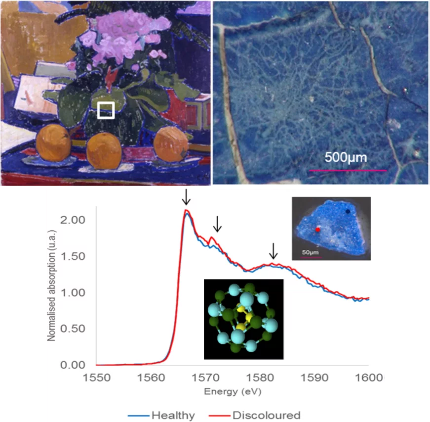 A specific case of synthetic ultramarine degradation was observed in three oil paintings from the early 20th century. Pigment particleswere found to have been discoloured, resulting in intricate patterns ofwhite lines, approximately 10 to 30 microns wide, criss-crossing the paint surface. Colour in ultramarine pigments comes from the encapsulated sulphur radical anions, chromophores, inside the cage framework built from SiO4 4 − and AlO4 5 − tetrahedral units linked by the oxygen atoms. In healthy pigment, the charge is balanced by cations such as sodium and the framework stabilises the reactive radicals, preserving the colour. This discolourationmechanismwas investigated using X-ray near edge spectroscopy (XANES). XANES was used at the aluminium K-edge to investigate the coordination of the Al atoms in the pigment framework. Using the focused synchrotron beamavailable at the PHOENIX beamline fromthe Swiss Light Source, scans with high spatial resolution (5 μm) and with a relatively low (2 μm) depth interaction could be performed, enabling analysis of the discoloured lines on samples collected fromone of the paintings. The comparison of spectra fromhealthy (blue) and discoloured (white) areas, supported a degradationmechanisminvolving the removal of aluminiumatoms from tetrahedral coordination in the ultramarine framework,which results in the formation of six-coordinate aluminiumcompounds separate fromthe pigment structure. This causes a permanent opening of the cage framework, enabling the reaction of the chromophore and subsequent colour loss..