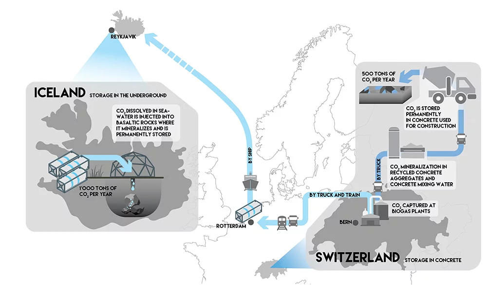 • To demonstrate the technical feasibility of using and storing CO2 captured at a Swiss industrial site (a biogas upgrading plant) and of generating negative emissions by (1) utilizing and storing it in primary and recycling concrete via a novel technology solution, thus realizing a domestic carbon capture, utilisation and storage (CCUS) value chain; (2) implementing a carbon capture, transport and storage (CCTS) value chain based on CO2 transport and permanent storage in a geological reservoir abroad using a novel injection technique.