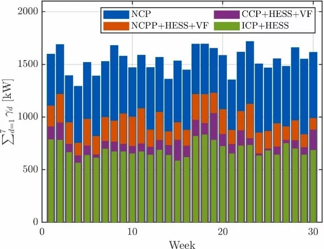 Following the demonstration of the technical feasibility for peak shaving, including the characterization of the involved systems, the potential to minimize the load peaks was determined. In the investigated setting, an average peak reduction of up to 49 % (blue vs. green bars in Fig. 2 was achieved). Ultimately, such hydrogen-based energy storage systems (even if not necessarily based on the use of pure oxygen) will help to minimize the costs of future electric grid expansions and avoid excessive curtailment.