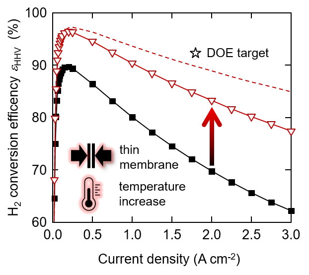 State of the art polymer electrolyte water electrolyzers typically use a perfluorinated proton exchange membrane of the Nafion type with a thickness of 150 to 200 micron and are operated at a cell temperature of up to 60°C. This conservative choice of materials and operating conditions ensures that the lifetime is in the range of ten thousands of hours. With a view to increasing the conversion efficiency, which corresponds to a decrease of the operating cell voltage, we investigated the effect of using a thinner membrane and increasing the cell temperature up to 120°C. We chose a Nafion membrane of 50 micron thickness. This is expected to reduce the ohmic resistance of the cell. The temperature increase is expected to lead to a reduction of the activation overpotential, in particular for the oxygen evolution reaction (OER), and an increase of the membrane conductivity. The figure shows the conversion efficiency of the water splitting reaction as a function of current density. The poor efficiency at low current density is a result of low faradaic efficiency due to gas crossover through the membrane. The curves go through a maximum and then decrease, which is a consequence of increasing overpotentials. As shown, with a combination of a 50 mm membrane and 120°C cell temperature, the efficiency can be increased by 15% at a current density of 3 A/cm2. Further reduction of the membrane thickness is limited by the gas diffusion through the membrane, which poses the risk of the formation of an explosive gas mixture (the lower explosion limit of H2 in O2 is 4%). The main overpotentials at 120°C with the thin membrane are related to the OER (0.34 V) and the ohmic resistance (0.36 V). The ohmic resistance is caused by the membrane, the interface between the anode catalyst layer and the titanium based porous transport layer, and electronic / contact resistances in the cell. If we could eliminate the latter, for example by a suitable coating on the titanium parts of the cell, the efficiency could be further enhanced (dashed line in the figure). The star indicates the development target by the US Department of Energy (DOE). We see that further development is necessary on the cell components to reach this goal. Moreover, the durability of the cell at elevated temperature needs to be studied in detail. Degradation phenomena are expected to be accelerated, which needs to be quantified to allow estimates of lifetime. This is the subject of ongoing studies.