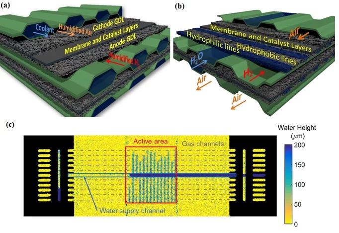 The modified GDL is placed on the anode side, with the hydrophilic/hydrophobic lines perpendicular to the gas channels. A small number of these channels are transformed into liquid water supply channels. The water brought in these channels is wicked directly by the hydrophilic lines, and spreads above several gas channels. Once in contact with the hydrogen flow, the water in the hydrophilic line evaporates, which provides the humidification and the cooling effect needed. Thanks to the constant supply of water, the hydrophilic lines are always filled, and high evaporation rates can be sustained as long as needed for different operating conditions. Meanwhile, the (very) hydrophobic lines remain dry pathways for the reactant gases and ensure a good operation of the cell.