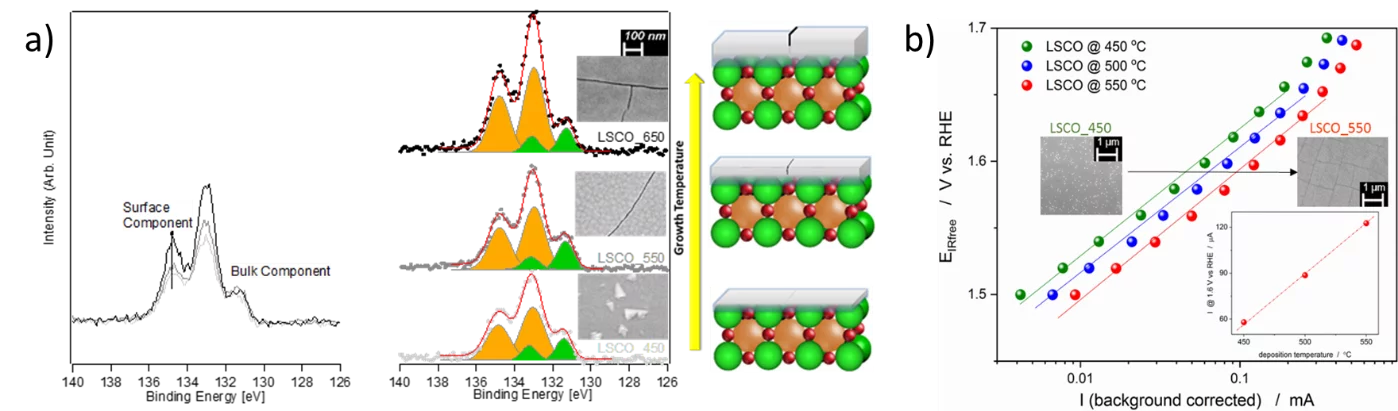 PSI researchers have studied the influence of surface segregation on the OER activity for the, La0.2Sr0.8CoO3-d (LSCO) perovskite, one of the most active perovskite towards the OER in alkaline electrolyte. LSCO has been produced in the form of thin films by means of pulsed laser deposition (PLD) using different deposition temperatures (between 350 and 650 °C). The morphology of the films has been characterized by means of SEM and atomic force microscopy (AFM) while the crystalline structures have been checked with X-ray diffraction (XRD). NAP-XPS has been used to check the surface composition of perovskite films synthesized at different temperatures, showing that high temperature favors strontium segregation in the topmost layers. However, strontium forms surface compounds that are efficiently removed when the catalyst surface is in contact with water. Indeed, NAP-XPS measurements revealed that after immersion in water, LSCO shows a cobalt rich surface, which is very active for the OER. More generally, higher deposition temperature in the 450-550°C range, translates into higher OER activity for the LSCO catalysts. Indeed, higher the perovskite synthesis temperature the more strontium segregation occurs on the surface. However, being the segregated strontium compounds soluble in water, they are easily removed when the surface of the electrode is in contact with the electrolyte, leading to the exposure of cobalt enriched layers very active for the OER.
