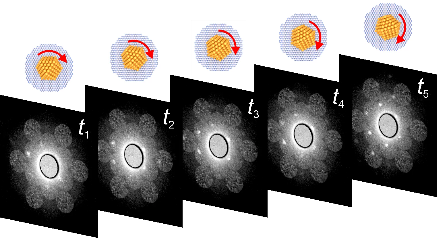 Dynamics of single Au nanoparticles on graphene were probed simultaneously in real- and diffraction space by time-series convergent beam electron diffraction.