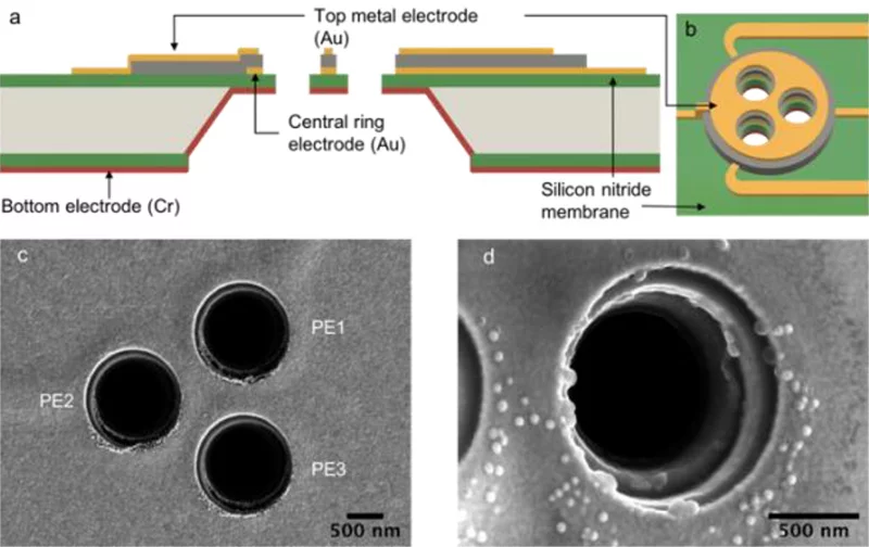 Paper abstract: We report a three-element Boersch phase shifter for the wavefront manipulation of coherent electron beam. A device with five-layer structure is fabricated on a suspended silicon nitride membrane by the state-of-the-art lithography. By including the top-contact-shielding electrode in the design, the five-layer structure is adopted to minimize the parasitic beam deflection observed in a recently reported simplified three-layer device that poses a critical obstacle for device upscaling. Despite the mechanical stresses caused by the additional layers, we produced the five-layer device on a thin silicon nitride membrane and successfully tested its performance of the voltage-controlled phase shift of coherent electron beam. The experiment confirmed that the parasitic beam deflection was suppressed. Our work paves a way toward the realization of a multi-element Boersch phase shifter for a programmable holographic synthesis of electron waves in two- and threedimensions.