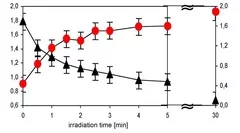 Changes of the O/Si (red) and C/Si (black) atomic ratios of PDMS exposed to 172 nm (16.6 mW/cm2 ) irradiation in air with various irradiation times as determined by XPS.