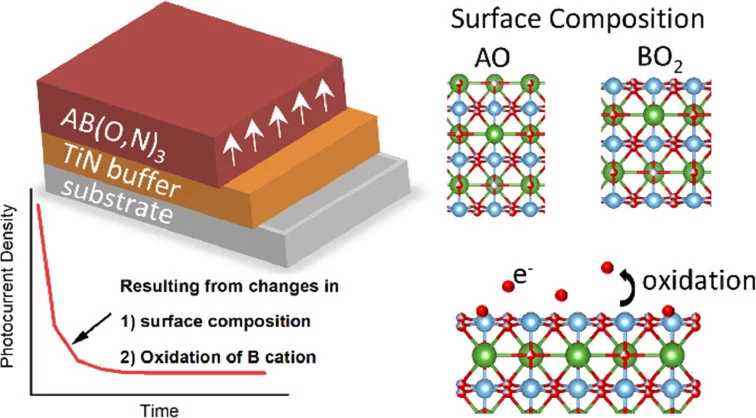 LaTiOxNy oxynitride thin films are employed to study the surface modifications at the solid- liquid interface that occur during photoelectrocatalytic water splitting. Neutron reflectometry and grazing incidence x-ray absorption spectroscopy were utilised to distinguish between the surface and bulk signals, with a surface sensitivity of 3 nm. Here we show, contrary to what is typically assumed, that the A cations are active sites that undergo oxidation at the surface as a consequence of the water splitting process. Whereas, the B cations undergo local dis- ordering with the valence state remaining unchanged. This surface modification reduces the overall water splitting efficiency, but is suppressed when the oxynitride thin films are decorated with a co-catalyst. With this example we present the possibilities of surface sensitive studies using techniques capable of operando measurements in water, opening up new opportunities for applications to other materials and for surface sensitive, operando studies of the water splitting process.