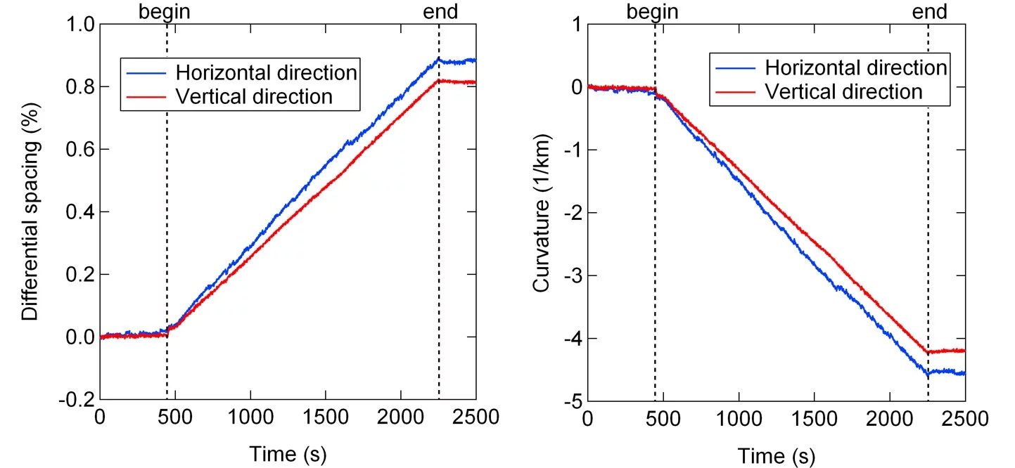 The figure shows a MOSS measurement during the deposition of 3YSZ on (001) silicon at room temperature along the horizontal and vertical direction. With increasing thickness (time) the differential spacing of the spots on the surface changes linearely, which corresponds to a linear change in curvature with increasing thickness. Graphs by Dieter Stender.